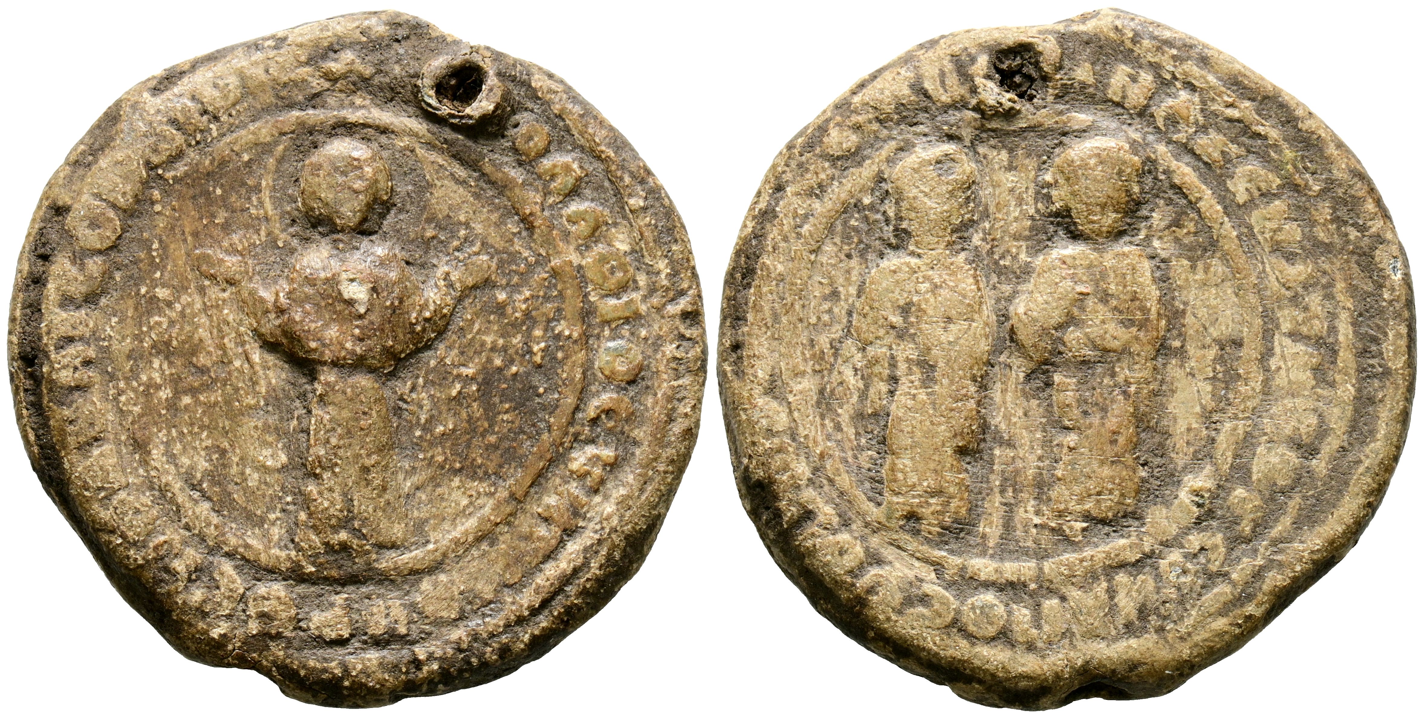 ANONIMO. Sello. (Pb. 25,99g/33mm). Posiblemente siglo XI. Anv: Virgen de ''Blachernitissa'', nimbada estante de frente con las brazos extendidos, alrededor leyenda circular entre gráfilas. Rev: Dos Santos estantes de frente, alrededor leyenda circular entre gráfilas. MBC. Pequeña perforacion en la parte superior.