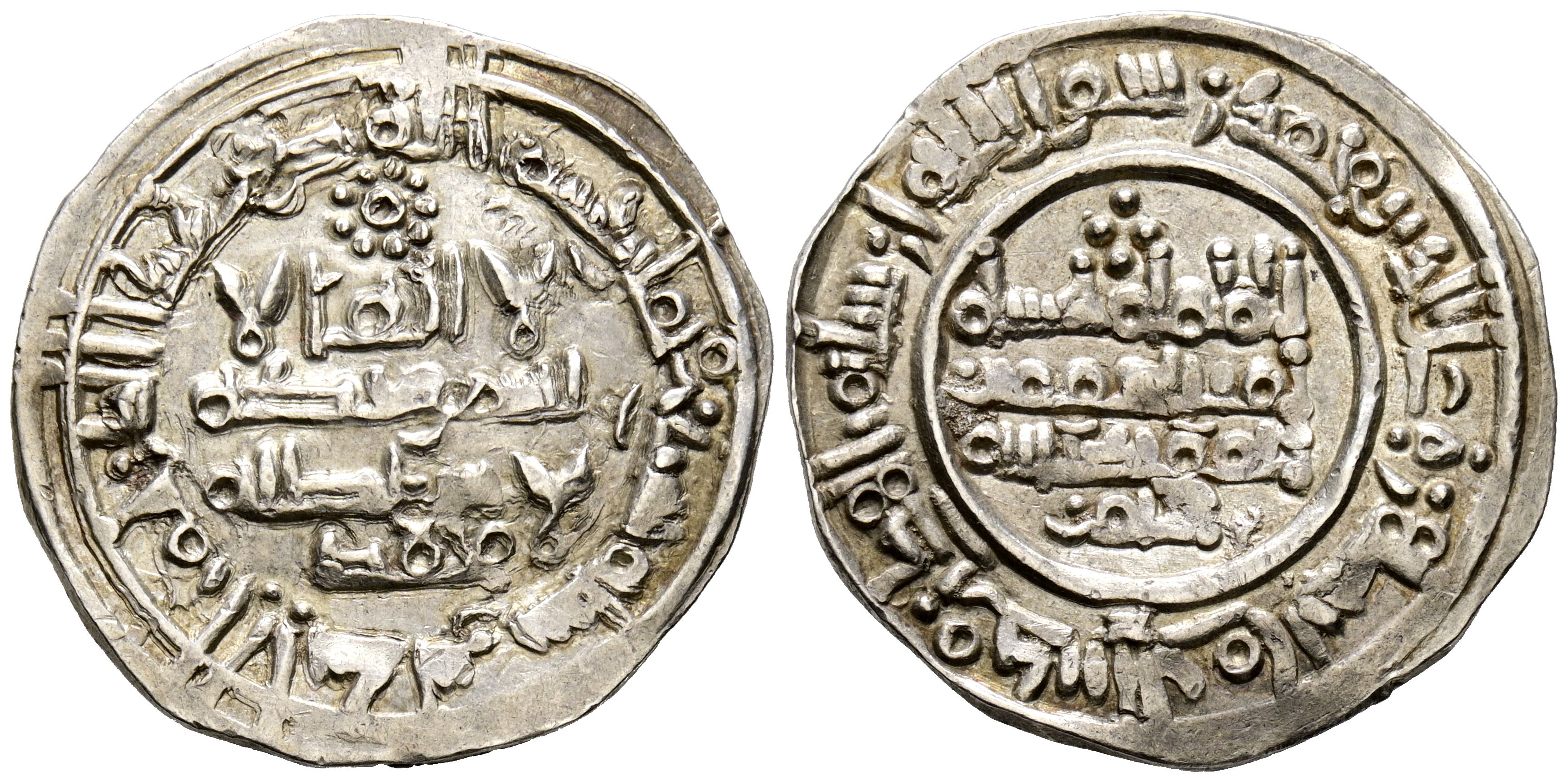 CALIFATO DE CÓRDOBA, Hisham II. Dirham. (Ar. 3,43g/24mm). 389H. al-Ándalus / الاندلس. (Vives 541; combinación de adornos no recogida en R. Frochoso). Citando a Muhammad en la IA y Amir en la IIA. MBC+.Ex Ibercoin, Subasta Online 23 (03/04/2019), Nº lote 391.