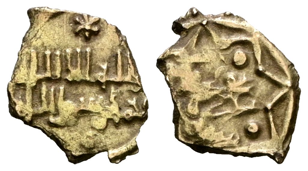 TAIFAS DEL CALIFATO, Anónimo atribuído a Toledo. Fracción de Dinar. (El. 0,34g/11mm). S/D. (Codera y Zaidin (1897) 1047 bis; Ibrahim, Cantó (2003) Suplemento a los Reinos de Taifas, nº 169, Francés nº362). Anv: لااله الاالله / محمدرسول الله. Rev: الله / الحو ل و القوة. (Para Dios / el poder y la fuerza). MBC. Escasa.Codera atribuyó esta pieza a Almería ''por tener alguna semejanza con algunos ejemplares del nº 1047" de Vives, aunque en el tesorillo donde aparecieron aquellos ejemplares, también contenía otros diferentes de las taifas de Toledo, Badajoz, Córdoba, Valéncia, Dénia y Zaragoza. Sin embargo, precediendo la intuición del doctor Alber Cantó, sería David Francés quien daría un razonamiento más lógico a su origen, en su libro ''De la legitimidad, las sucesiones y su reflejo en las acuñaciones andalusíes'' pág. 137-139, justificando la atribución de esta pieza a Toledo, durante la presencia de 'Umar al-Mutawakkil rey de Badajoz.