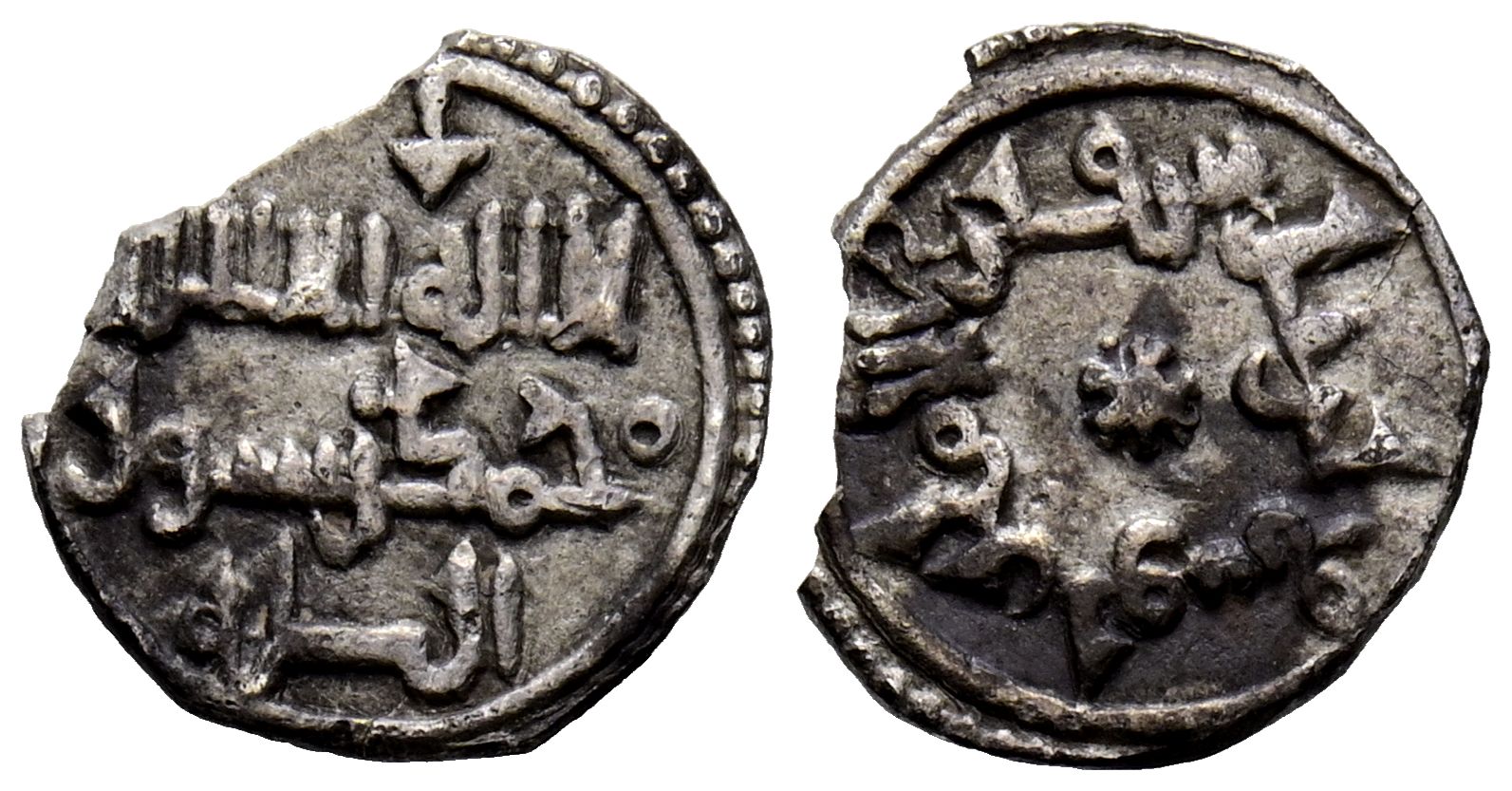 ALMORÁVIDES, Yusuf ben Tashfin (480-500H.). Quirate. (Ar. 0,55g/11mm). S/D. (Vives no cita; Hazard no cita; Benito Ba15). Anv: 'Shahadah' en tres líneas. Rev: الامير/ توسف / ابن قا / شفين. en cuadrado con estrella central. MBC-. Cospel faltado. Muy rara.