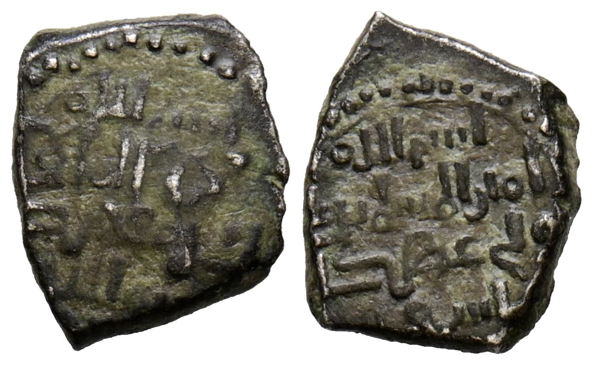 ALMORÁVIDES, Ali ibn Yusuf y el Amir Tashfin (533-537H./1139-1143). Fracción de dirham. (Ar. 0,64g/10mm). Atribuído a Jaén. (Francés, MANQUSO 10, página 27, nº 7). Citando a un deconocido personaje: سعد (Sacd) en ambas áreas. MBC+. Muy rara.