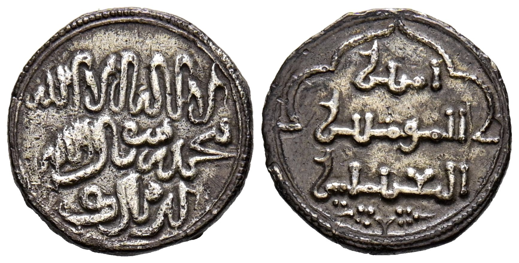 ALMORAVIDES, Ibn Malik. Quirate. (Ar. 0,90g/12mm). S/D. (Benito K2; Vives 1919; Delgado XVIII-25; Canto e Ibrahim 677). Personaje histórico desconocido del que solo se tiene constancia a través de 3 acuñaciones distintas hasta el momento, el cual en sus monedas reivindica al Califa 'Abasida. Anv: Con caligrafia nasjí, 'Shahadah' en tres líneas, debajo cita al propio Ibn Malik / ابن مالك. Rev: En cúfico ornamental, reconocimiento al califa de oriente: امير / المؤمنين / العبا سي. MBC+. Preciosa pátina. Muy raro e interesante ejemplar.