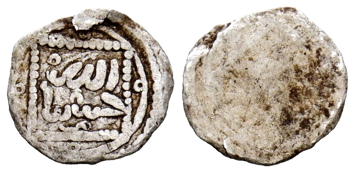 ALMOHADES, Anónimo. 1/16 Dirham de tipo almorávide. (Ar. 0,09g/7mm). S/D. Anv: الله / حسبنا (Dios me basta), debajo en lugar de ceca ¿مس?. Rev: Anepígrafo. MBC. Inédita.Este raro divisor a medio camino entre la tradicional forma redonda del Quirate y la leyenda del 1/8 de Dirham almohade cuadrado (Hohertz 645), contiene en su diseño algunas caracteristicas similares a los 1/2 Dirhams redondos atribuidos por Peña Martín a Idris I (Hohertz 633 y notas).