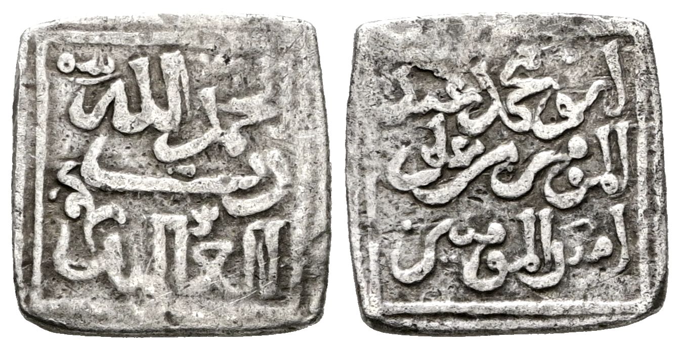 ALMOHADES, Abd al-Mumin ibn Ali. Dirham en tipo de 1/2 Dirham. (Ar. 1,50g/12mm). S/D. (Brethes 1050; Hazard 1067; Medina p443,nota 2; Hohertz 548b). Variante con Alif y Lam unidas por la parte supeiror en la ultima línea de anverso. MBC. Muy rara.