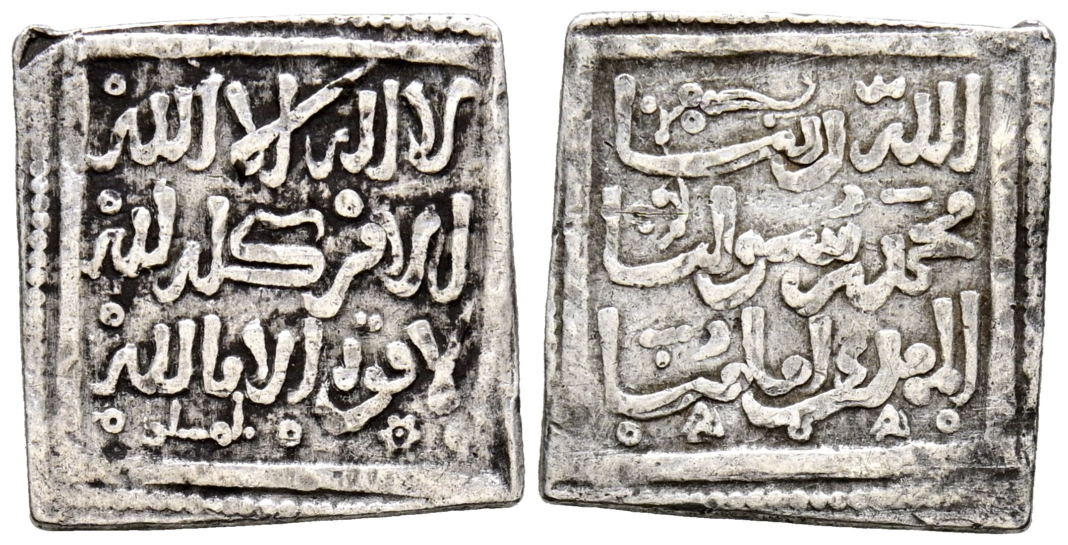 ALMOHADES. Anónimo a nombre del imán Al-Mahdi. Dirham. (Ar. 1,51g/15mm). Fez / فاس. (Vives 2107 var; Hazard 1095var, Hohertz 601e-var). Variante con cenefa de roeles y triángulos en la parte inferior del IIA. MBC. Interesante ejemplar.