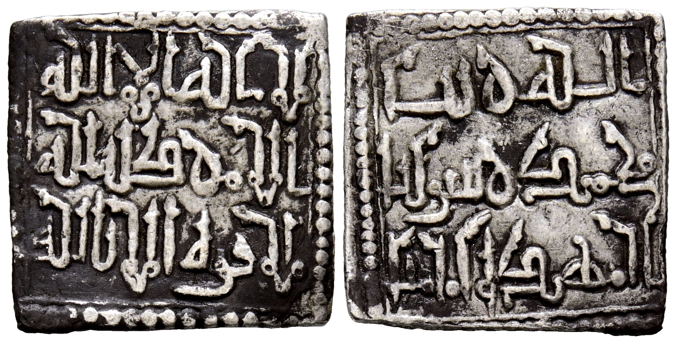 ALMOHADES, Anónimo a nombre de Al-Mahdí. Dirham. (Ar. 1,44g/15mm). S/D. (Hazard 1123 var; Hohertz 617). MBC. Escaso y muy bello ejemplar. Esta pieza presenta una caligrafía cúfica ornamental muy llamativa al estilo Hafsí y similar a las monedas atribuidas a Abu Hafs 'Umar al-Murtada con ceca 'Al-Hadrat al-Muminiya al-Murtadiya' (Honertz 563). Por tanto, posiblemente fue acuñada en la misma época por algún gobernador de la zona.