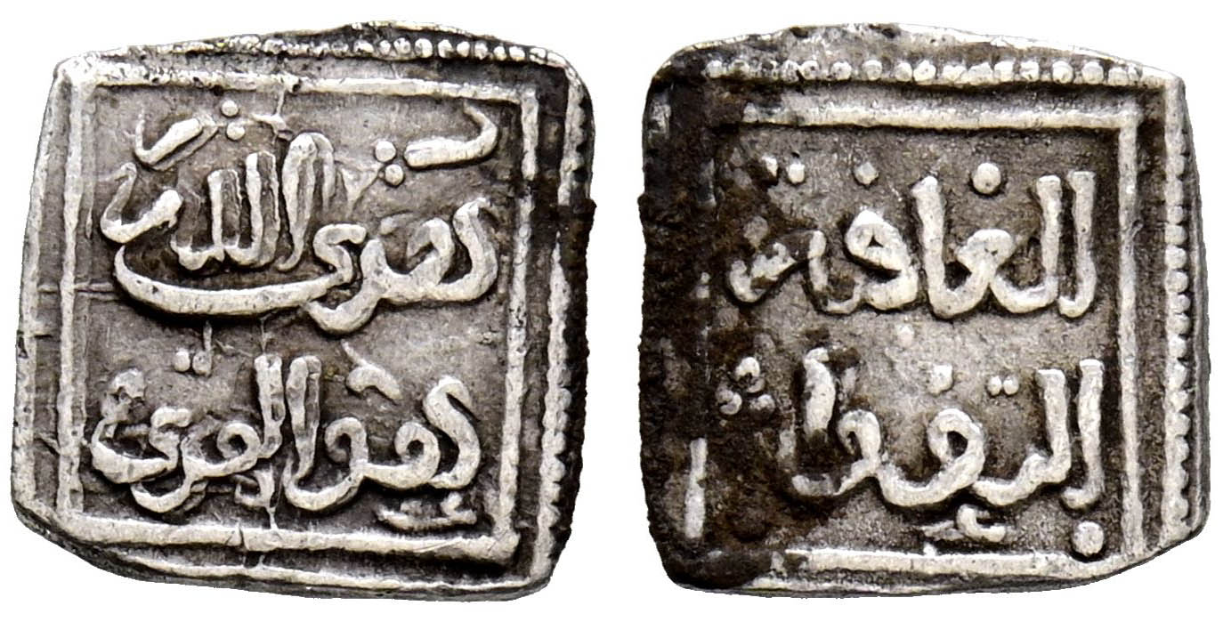 ALMOHADES, Anónimo. 1/4 Dirham. (Ar. 0,38g/9mm). (Vives 2209, como Nazarí; Medina 203a; Hohertz 636). Anv: هدى الله / هو الهدى. (La guía de Allah / es la guía). Rev: العا قبة / التقوا. (La recompensa del más allá / pertenece a los devotos). MBC+. Buena acuñación para este tipo.