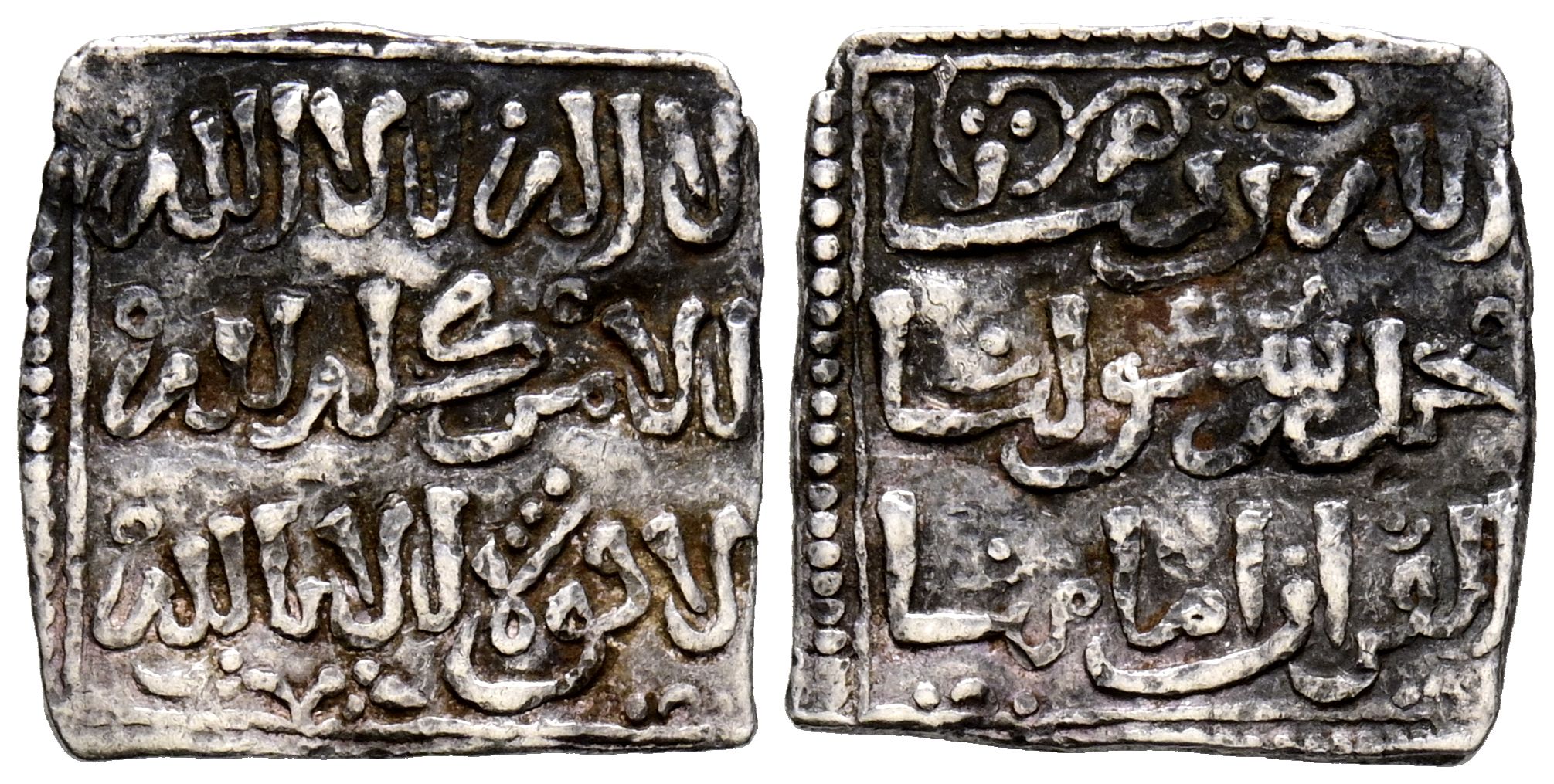 ANTI-ALMOHADES (Meriníes). Anónima. Dirham. (Ar. 0,90g/14mm). Sin ceca. (Hohertz 835; Medina 205). En la última línea de la IIA aparece en lugar de Al-Mahdi, la mención al Corán: 'El Corán es nuestro Iman'. MBC. Escasa.
