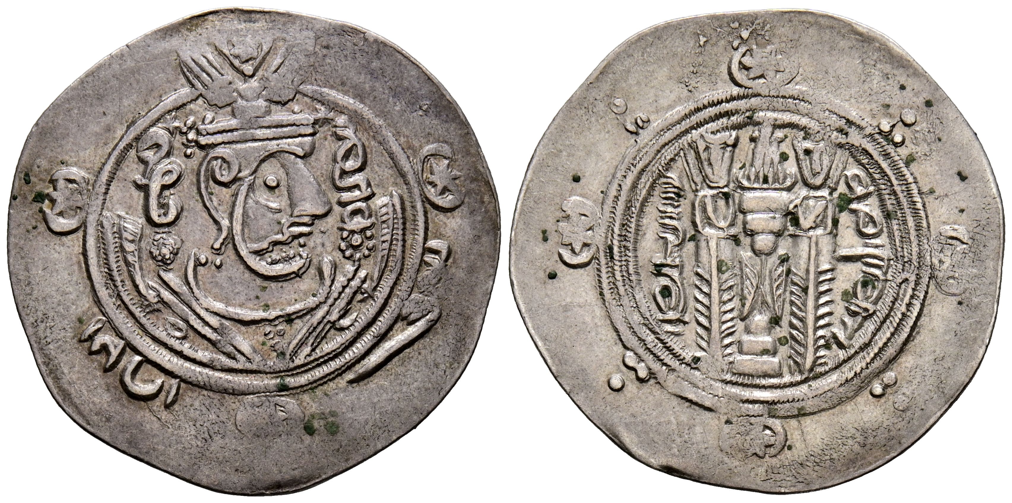 CALIFATO ABASIDA, Anónimo. Dirham Tabari. (Ar. 2,01g/24mm). 136 PYE/171H/787-8 d.C. Tabaristán. (Álbum73). Anv: Busto con corona alada mirando a derecha de tipo sasánida, leyenda en palavhi: a la derecha, ABZUD (Crecimiento) y a la izquierda, GDH (Explendor). En el exterior, a las 2h, 6h y 10h, creciente y estrella. Abajo a la derecha la palabra palavhi: ADB (Excelente) y a izquierda NEK (Bueno). Rev: Altar de fuego flanqueado por dos sacerdotes, a la derecha: Tapurstan (Tabaristán), y a izquierda año de acuñación: 136 PYE (Post Yazgard Era) dentro de 3 orlas, en el exterior, a las 12h, 3h, 6h y 9h creciente y estrella, y en medio de estos adornos 3 puntos en forma de triángulo. MBC+. Puntos de verdín en Reverso.