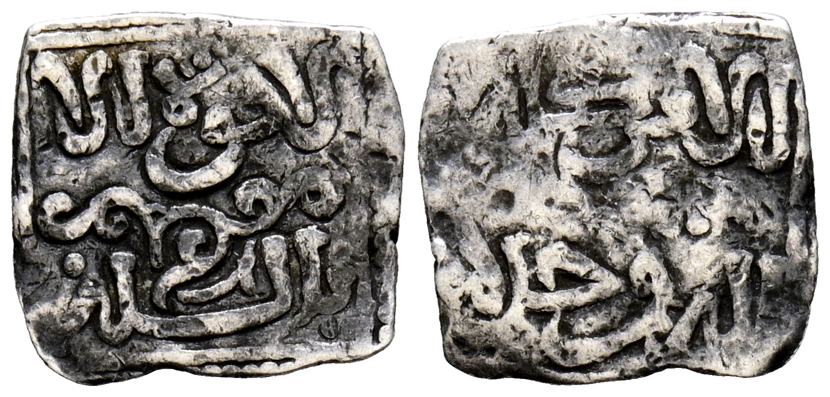 MERINÍES. Anónima. 1/3 dirham. (Ar. 0,44g/11mm). Sin ceca. (Hohertz 853). Anv: لا قوة الا / بالله. Rev: الأمر كله / لله وحده. MBC. Raro ejemplar.