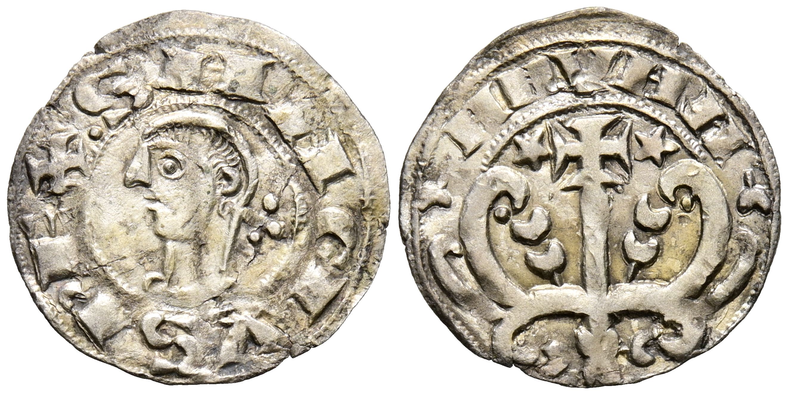SANCHO VI (1150-1194). Dinero. (Ve. 0,93g/19mm). Navarra. (Crus V.S. 222 var). Anv: Cabeza de Sancho VI a izquierda dentro de gráfila perlada, alrededor leyenda: SANCIVS REX. Rev: NAVARA en arco sobre árbol superado por cruz con estrellas de cinco puntas sin circulo interior a los lados. MBC+. Oxidaciones limpiadas. Escasa.