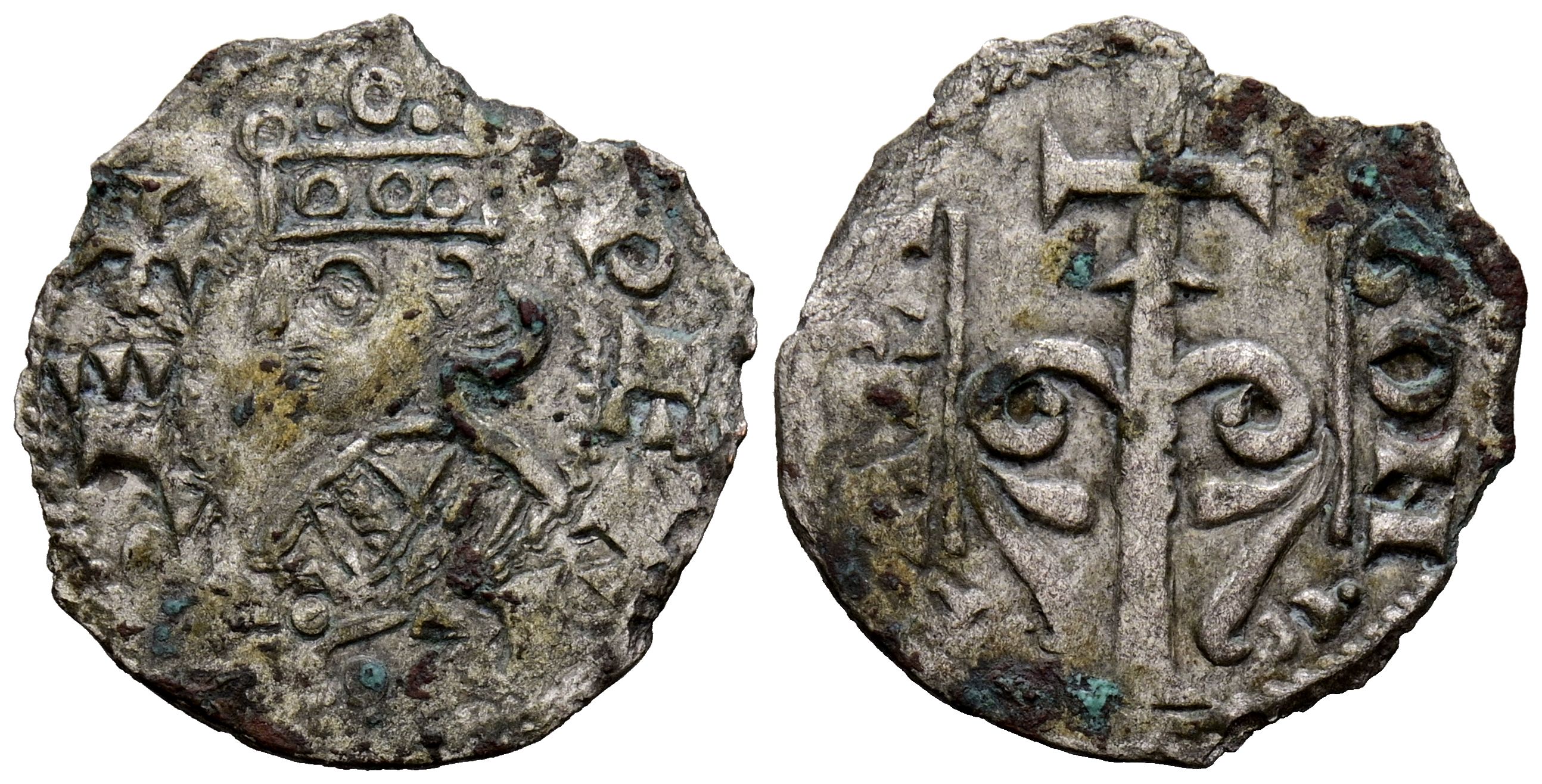 PEDRO I (1196-1213). Dinero. (Ve. 0,81g/18mm). Aragón. (Cru.V.S. 302). Anv: Busto coronado de Pedro I a izquierda, alrededor leyenda: PETR REX. Rev: Arbol superado de la Cruz, a los lados de manera vertical leyenda: ARAGON. MBC-. Cospel faltado y oxidaciones. Escasa.