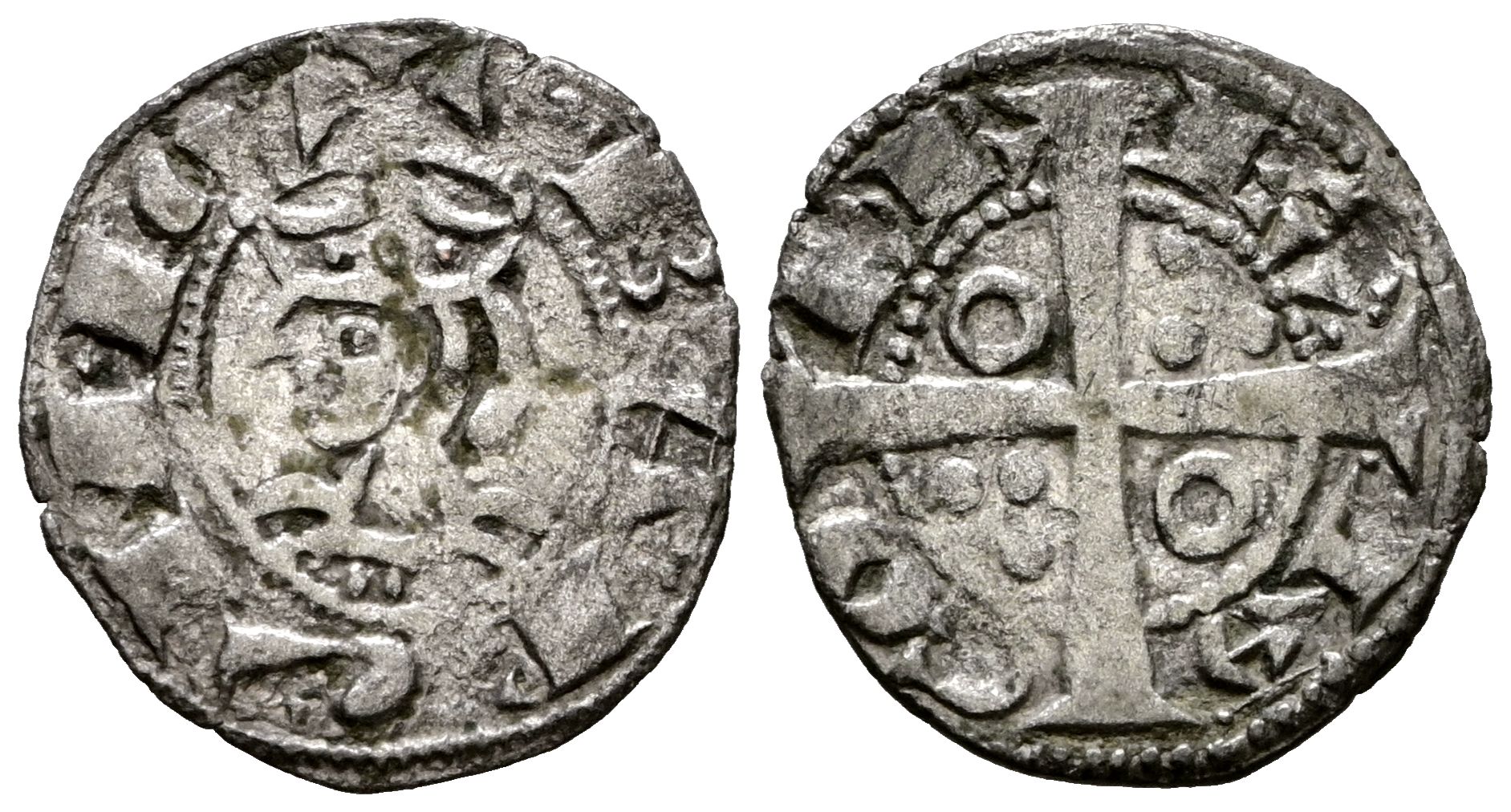 JAIME I (1213-1276). Dinero. (Ve. 0,92g/18mm). Barcelona. (Cru.V.S. 308). Anv: Busto coronado de Jaime I a izquierda, alrededor leyenda: BARQVINO. Rev: Cruz dentro de gráfila, en el 1º y 4º cuadrante tres puntos, en el 2º y 3º cuadrante roeles, alrededor leyenda: IACOB REX. MBC.