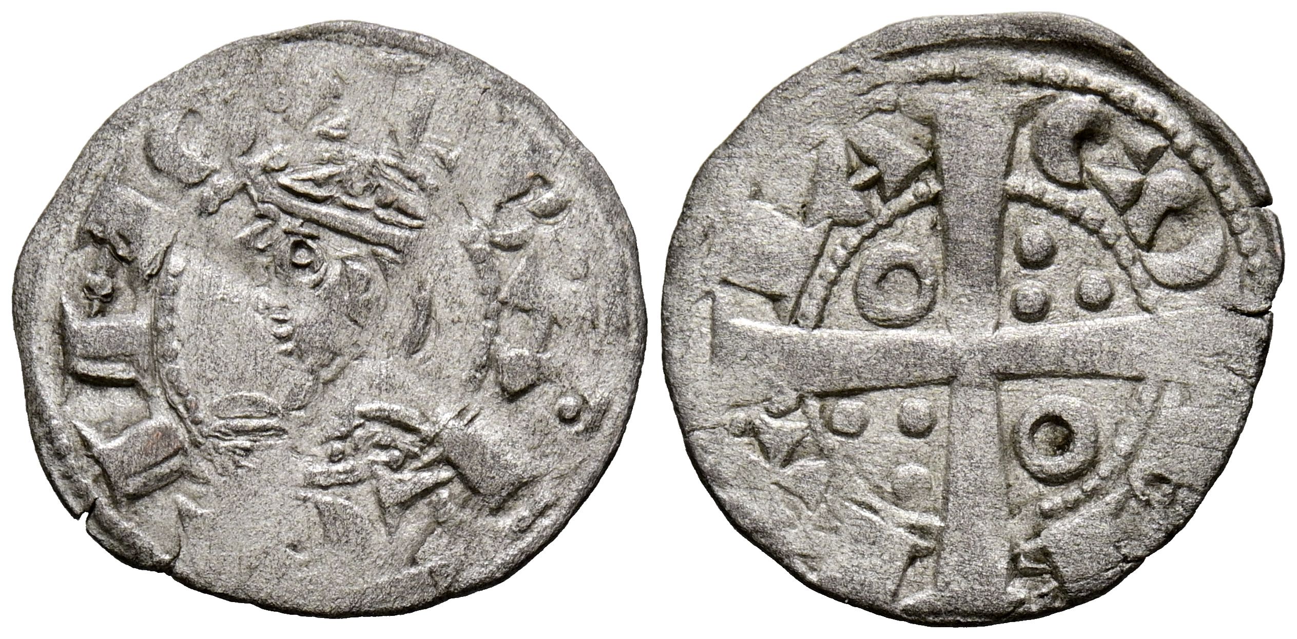 JAIME I (1213-1276). Dinero. (Ve. 0,83g/17mm). Barcelona. (Cru.V.S. 308). Anv: Busto coronado de Jaime I a izquierda, alrededor leyenda: BARQVINO. Rev: Cruz dentro de gráfila, en el 1º y 4º cuadrante roeles, en el 2º y 3º cuadrante tres puntos, alrededor leyenda: IACOB REX. MBC.