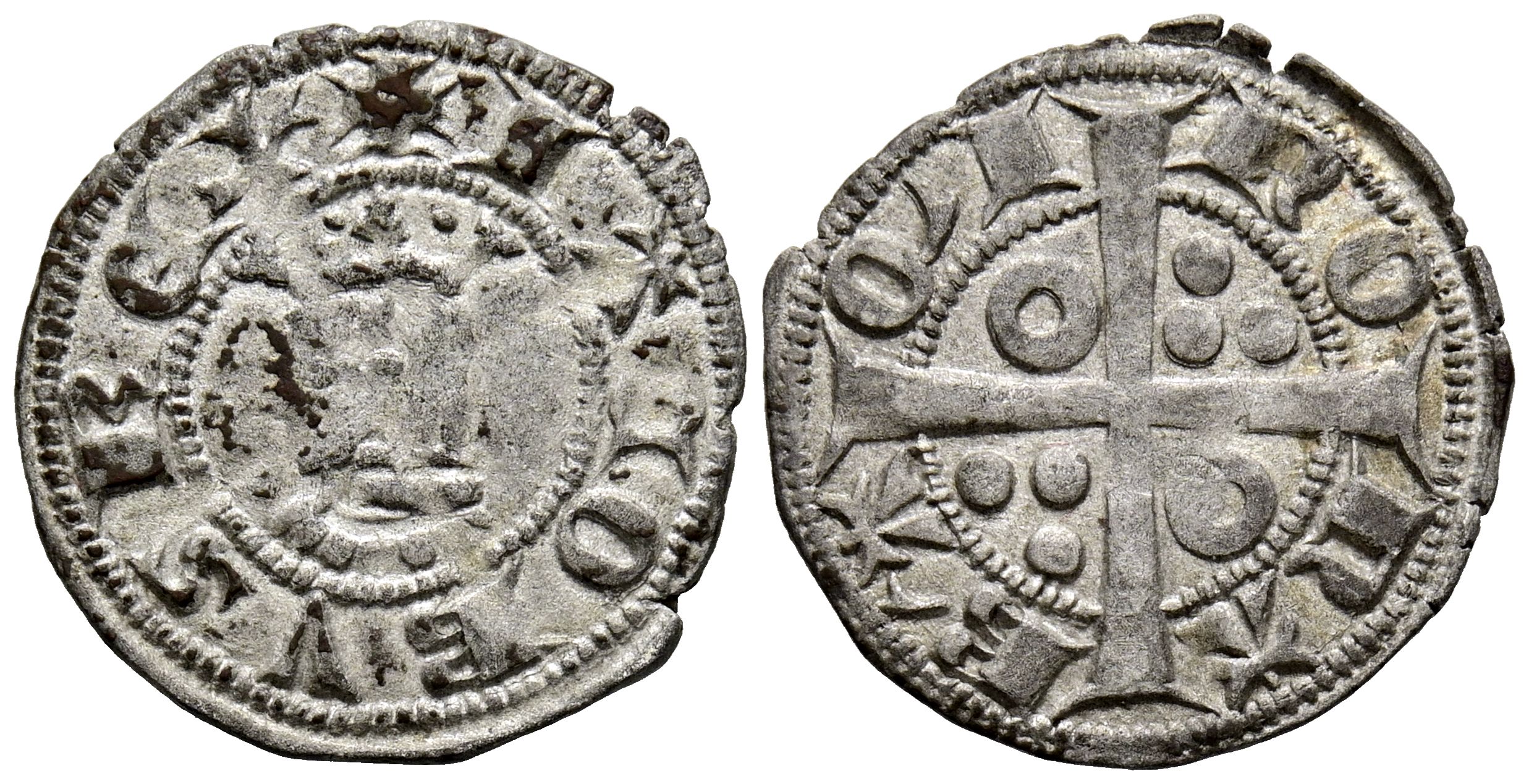 JAIME II (1291-1327). Dinero. (Ve. 0,87g/17mm). Barcelona. (Cru.V.S. 344). Anv: Busto de Jaime II coronado izquierda dentro de una gráfilar circular, alrededor leyenda: IACOBVS REX. Rev: Cruz pasante con anillos en 1º y 4º cuadrante y tres puntos en 2º y 3º cuadrante, alrededor leyenda: BA-CI-NO-NA. MBC+. Interesante ejemplar.