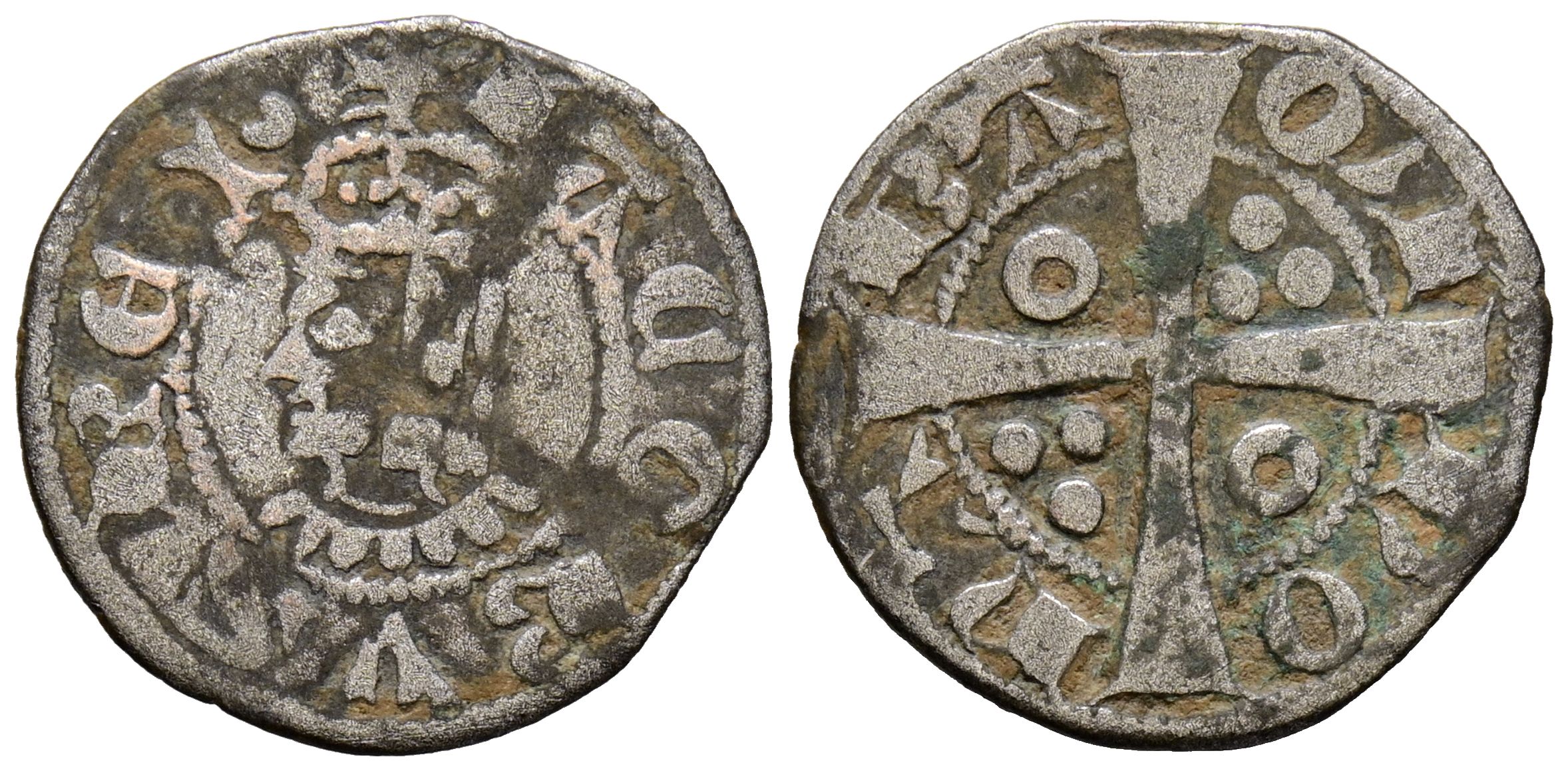 JAIME II (1291-1327). Dinero. (Ve. 0,86g/16mm). Barcelona. (Cru V.S. 346). Anv: Busto coronado de Jaime II a izquierda, alrededor leyenda: IACOBVS REX. Rev: Cruz patada con roel en el 1º y 4º cuadrante y tres puntos en el 2º y 3º, alrededor leyenda: BAQINONA. MBC+.