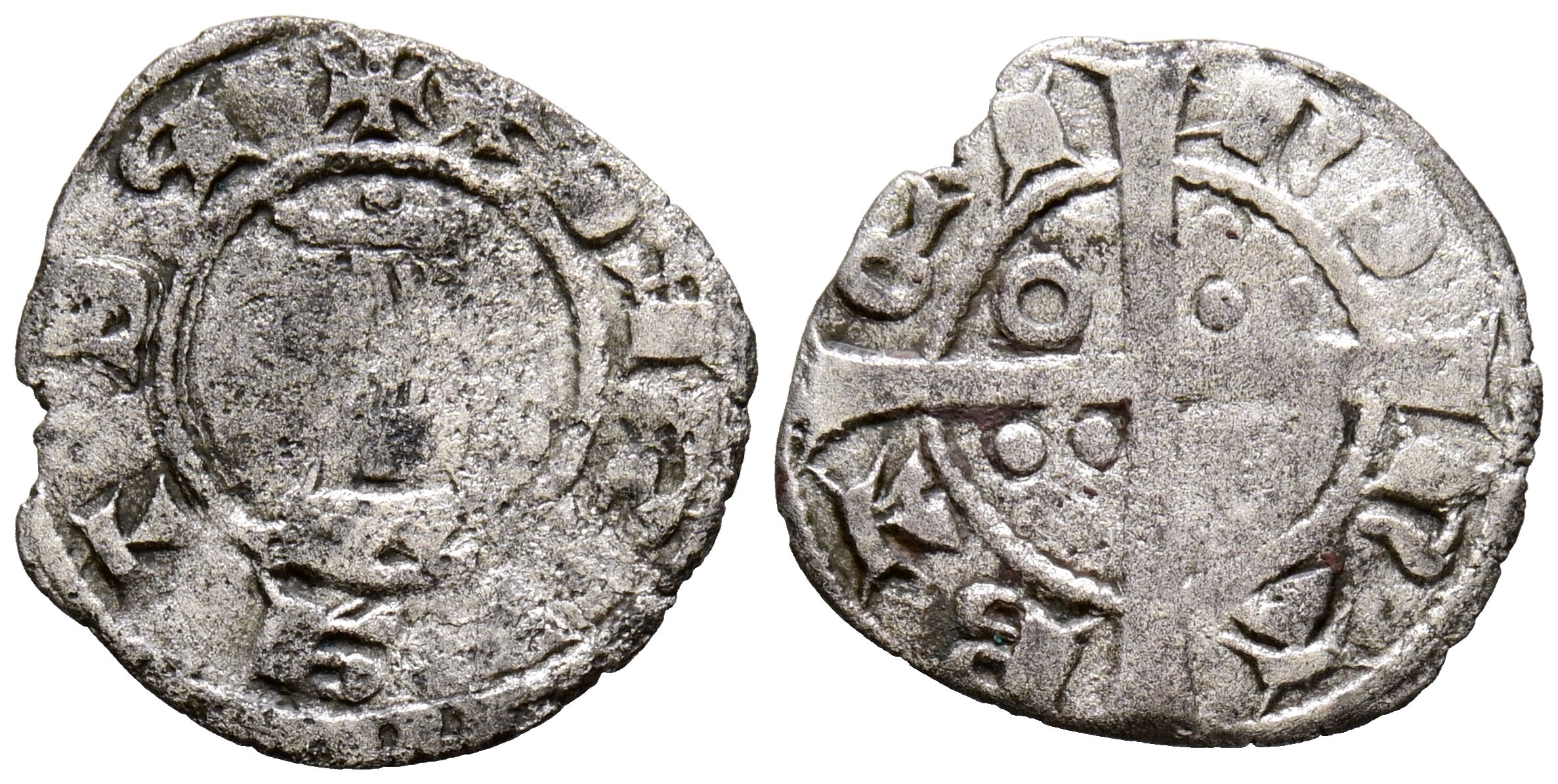 Pedro III (1336-1387). Dinero. (Ve. 0,81g/17mm). Barcelona. (Cru. V.S 428). Anv: Busto coronado de Pedro III a izquierda, alrededor leyenda retrógrada: PETRVS REX. Rev: Cruz pasante con anillos en 1º y 4º cuadrante y tres puntos en en 2º y 3º, alrededor eleyenda: BA QI NO NA. Pocos ejemplares conocidos. BC+. Rara.