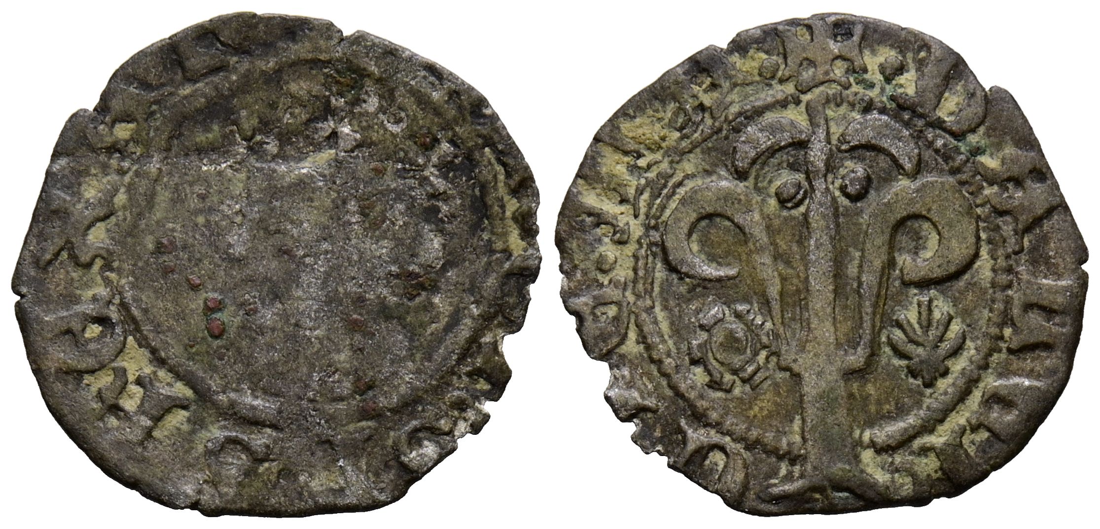 ALFONSO IV (1416-1458). Dinero. (Ae. 0,56g/15mm). Valencia. (Cru. V.S. 868). Anv: Busto coronado de Alfonso IV a izquierda, alrededor leyenda: ALFONSVS REX. Rev: Arbol superado de la Cruz entre las marcas, marco y cardo, alrededor leyenda: VALENCIA. MBC. Escaso ejemplar.