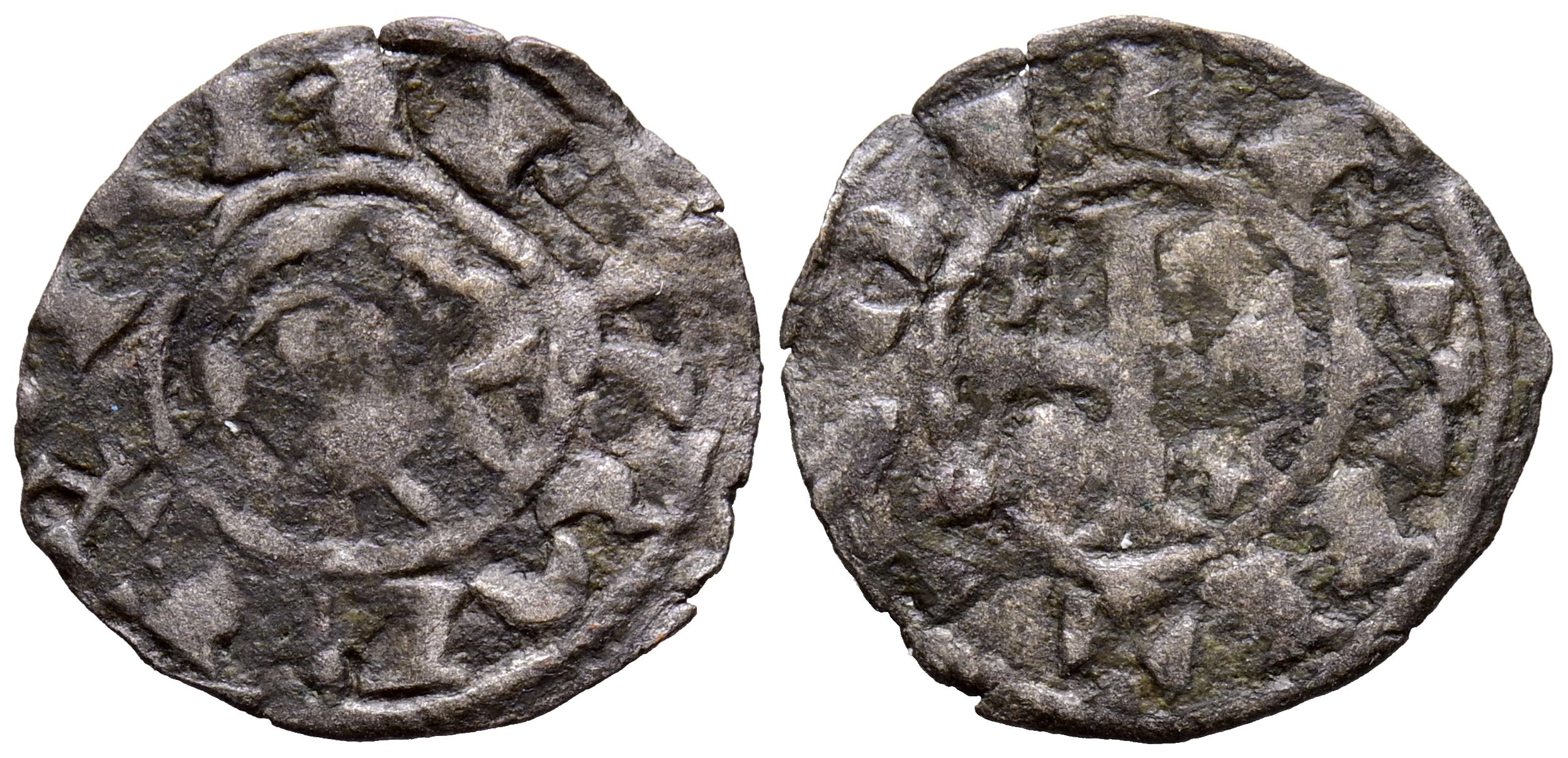 ALFONSO VIII (1158-1214). Dinero. (Ve. 0,58g/17mm). Toledo. (Imperatrix A8:33.1; FAB-23, como Alnfonso I). Anv: Busto de Alfonso VIII a izquierda, alrededor leyenda: ANFVS REX. Rev: Cruz patada con estrella en 1º y 4º cuadrante, alrededor leyenda: TOLLETA. MBC. Patina oscura.