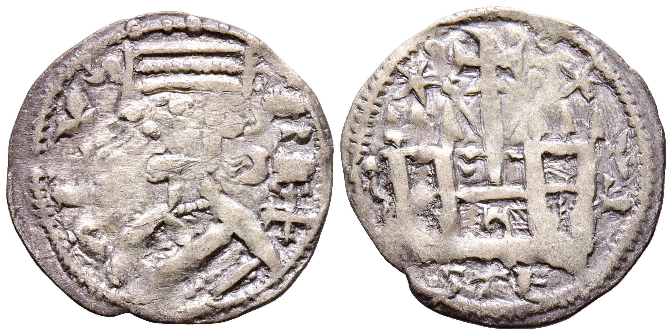 ALFONSO VIII (1158-1214). Dinero. (Ve. 0,95g/17mm). Toledo. (Imperatrix A8:36.33; FAB-205). Anv: Busto coronado de Alfonso VIII a izquierda, alrededor leyenda: ANFVS REX. Rev: Castillo con cruz central, sobre las torres estrellas, alrededor leyenda: CASTELE. MBC.