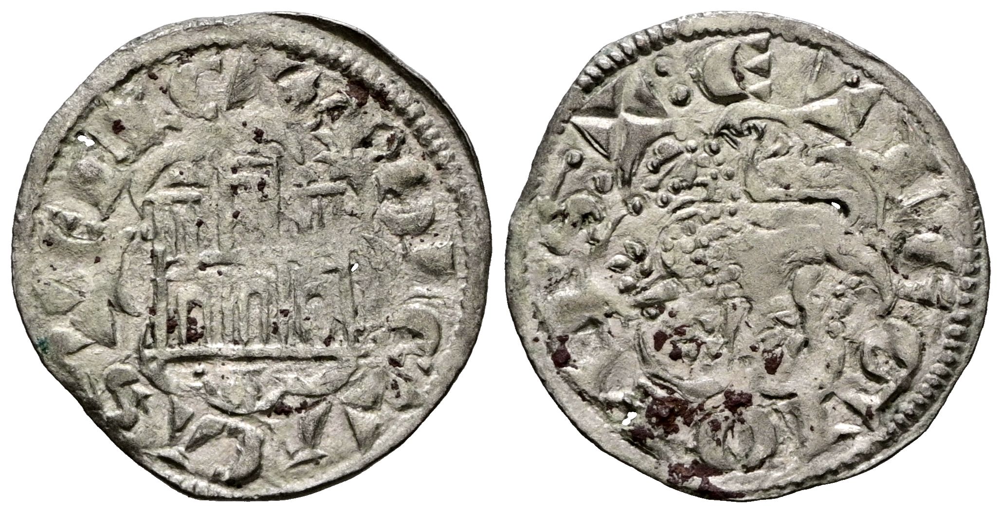 ALFONSO X (1252-1284). "Nueva Blanca" Alfonsí. (Ve. 0,73g/19mm). Santiago de Compostela o Coruña. (Imperatrix A10:11.38; FAB-264, como novén). Anv: Castillo y debajo venera, todo dentro de gráfila lobular, alrededor leyenda: MONETA CASTELLE. Rev: León rampante a izquierda dentro de gráfila lobular, alrededor leyenda: ET LEGIONIS. MBC.