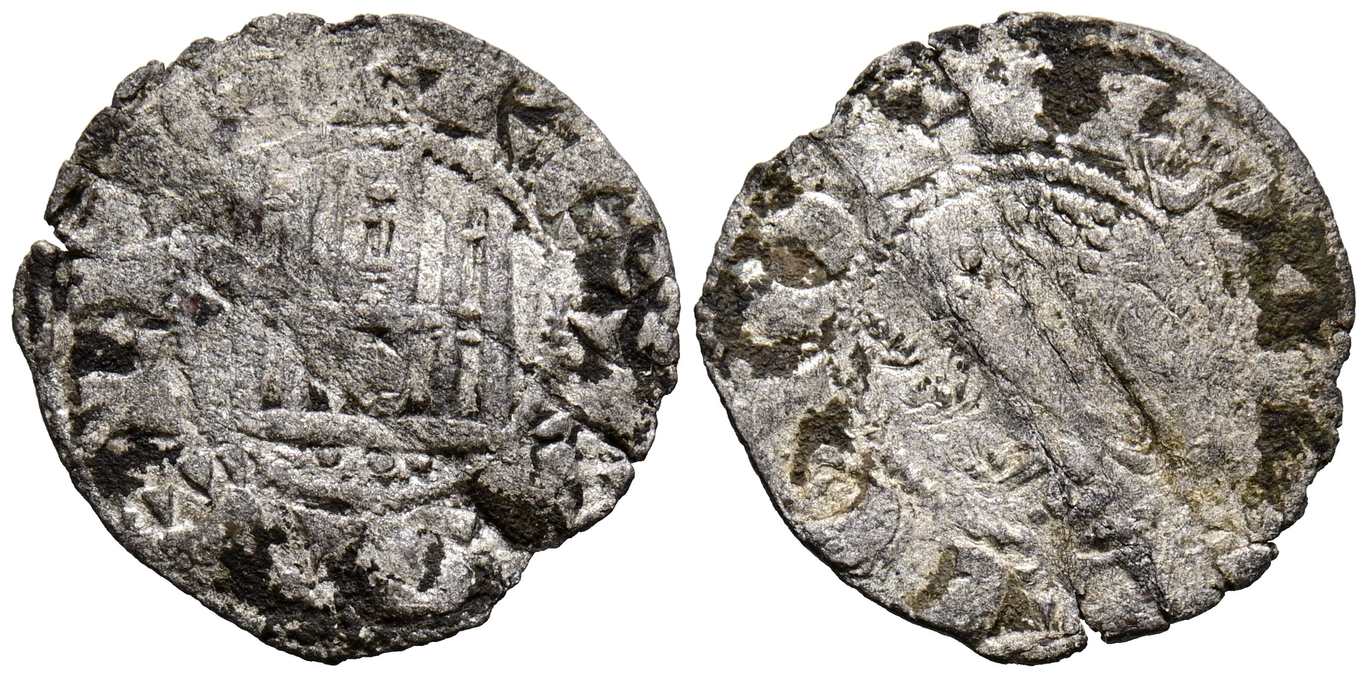FERNANDO IV (1295-1312). Dinero. (Ve. 0,81g/19mm). Ceca indeterminada. (Imperatrix-F4:2.51, mismo ejemplar; FAB-328var). Anv: Castillo, debajo tres puntos como marca de ceca, todo dentro de gráfila circular, alrededor leyenda: REX STELLE. Rev: León rampante a izquierda dentro de gráfila circular, alrededor leyenda: ET LEGIONIS. MBC. Marcas de doblez central. Muy rara. Unico ejemplar conocido con esta variación de leyenda.