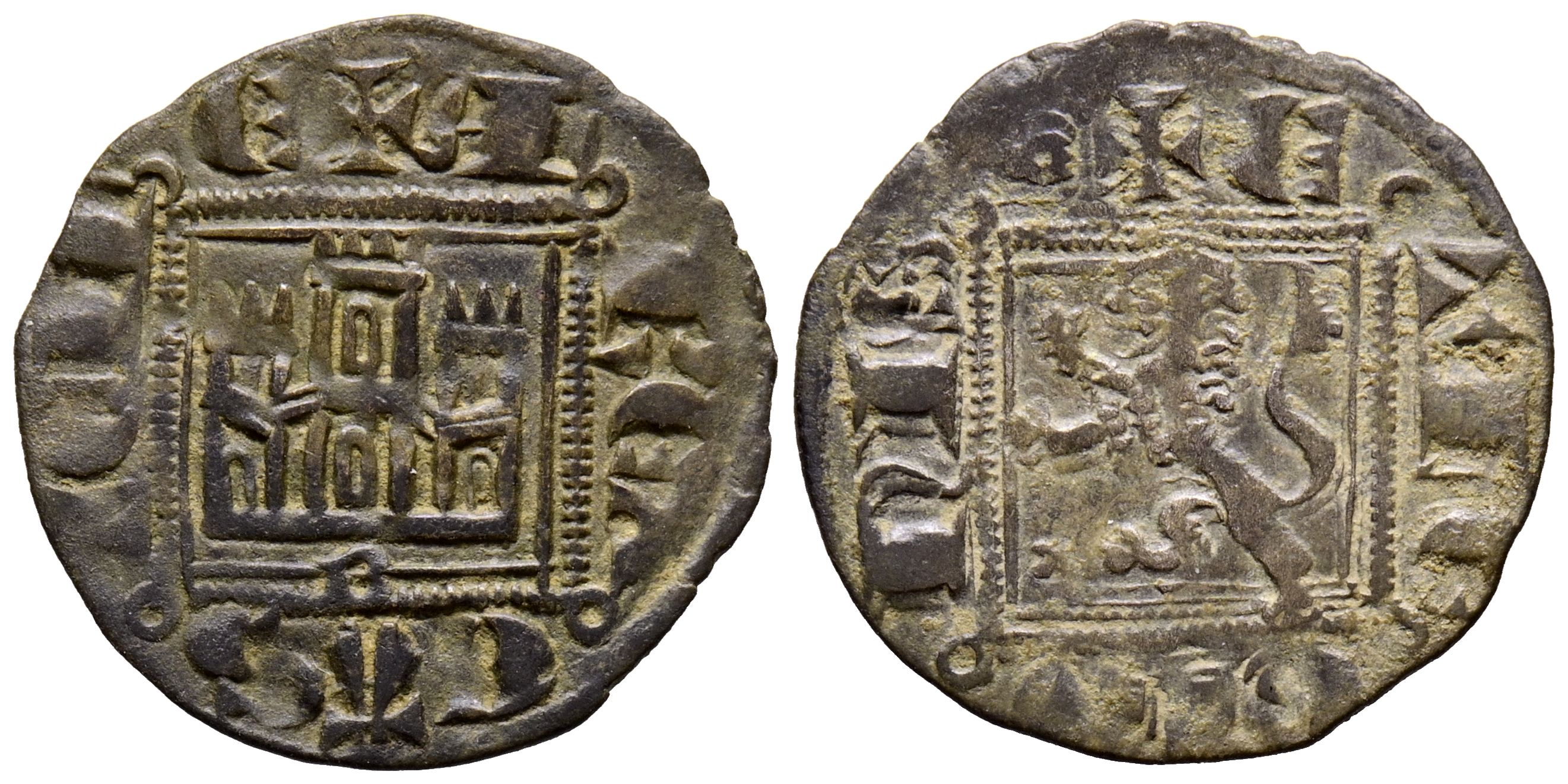 ALFONSO XI (1312-1350). Dinero Novén. (Ve. 0,76g/18mm). Burgos. (Imperatrix A11:1.6; FAB-355.2). Anv: Castillo, debajo B, todo dentro de gráfila cuadrada, alrededor leyenda: A REX CASTELLE. Rev: León rampante a izquierda con aspa a los pies, alrededor leyenda: ET LEGIONIS. MBC+.