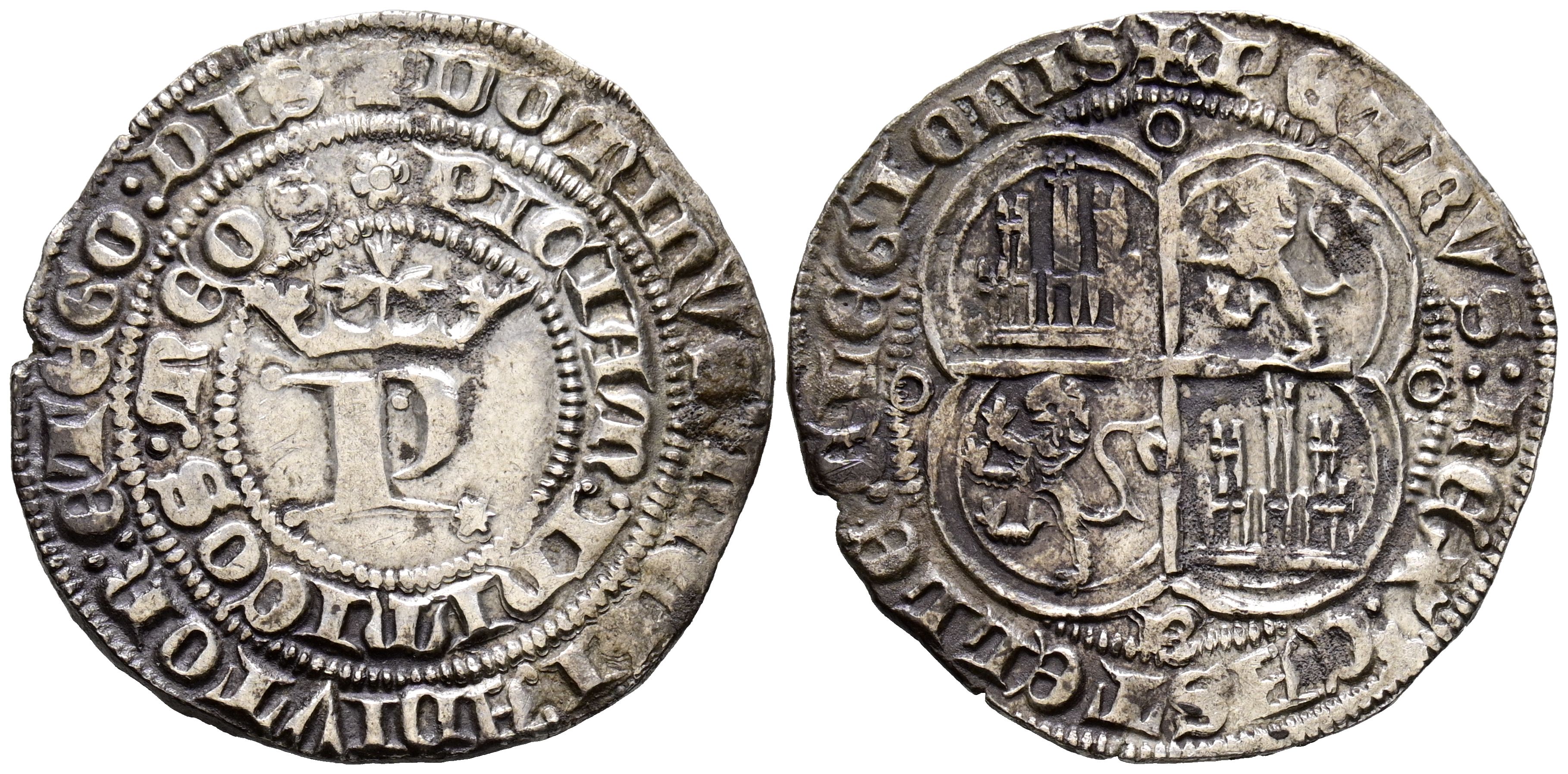 PEDRO I (1350-1368). Real (Ar. 3,50g/25mm). Burgos. (Imperatrix P1:12.13; FAB-378.4). Anv: P coronada con estrella en el extremos derecho de la base, alrededor leyenda circular en dos líneas: DOMINVS MICHI ADIVTOR ET EGO DISPICIAM INIMICOS MEOS. Rev: Cuartelado de castillos y leones rampantes a izquierda dentro de gráfila cuatrilobular, debajo B, alrededor leyenda: PETRVS REX CASTELLE E LEGIONIS. MBC+. Tono.