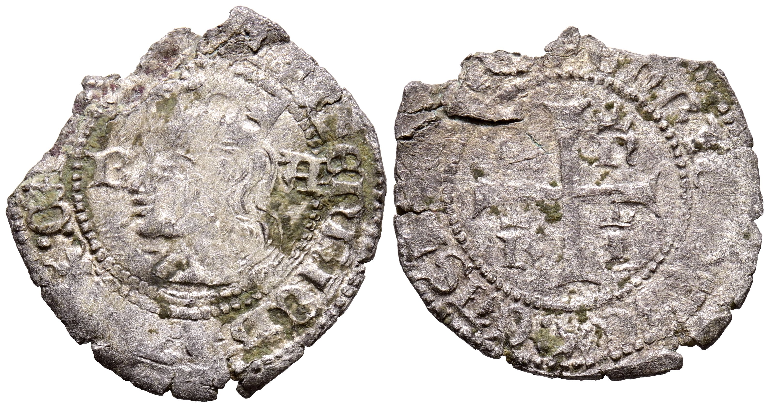 ENRIQUE II (1368-1379). Cruzado (Ve. 1,17g/21mm). Badajoz. (Imperatrix E2:11.20; FAB-465var). Anv: Cabeza coronada de Enrique II a izquierda, entre: B-A, todo dentro de gráfila circular, alrededor leyenda: ENRICVS REX LEGIONIS. Rev: Cruz griega, en los cuarteles E-N-R-I coronadas y alrededor leyenda: ENRICVS REX CASTELLE. BC+. Cospel faltado. Escasa.