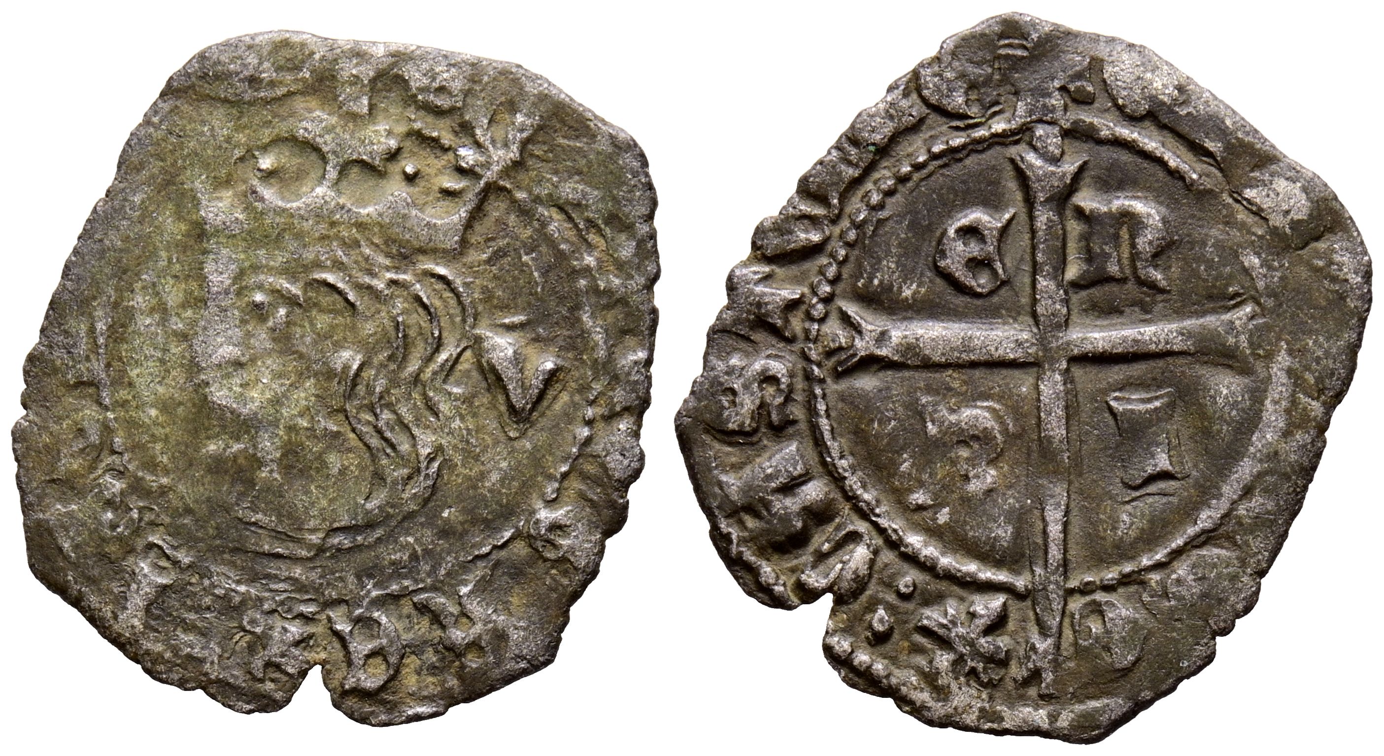 ENRIQUE II (1368-1379). Cruzado. (Ve. 1,17g/21mm). Valencia de Alcántara o Valladolid. (Imperatrix E2:11.69; FAB-476, como Villalón). Anv: Cabeza coronada de Enrique II a izquierda, detrás V, todo dentro de gráfila circular, alrededor leyenda: ENRICVS REX LEGIONIS. Rev: Cruz latina rompiendo gráfila, en los cuarteles E-N-R-I y alrededor leyenda: ENRICVS REX CASTELLE. MBC-. Escasa.