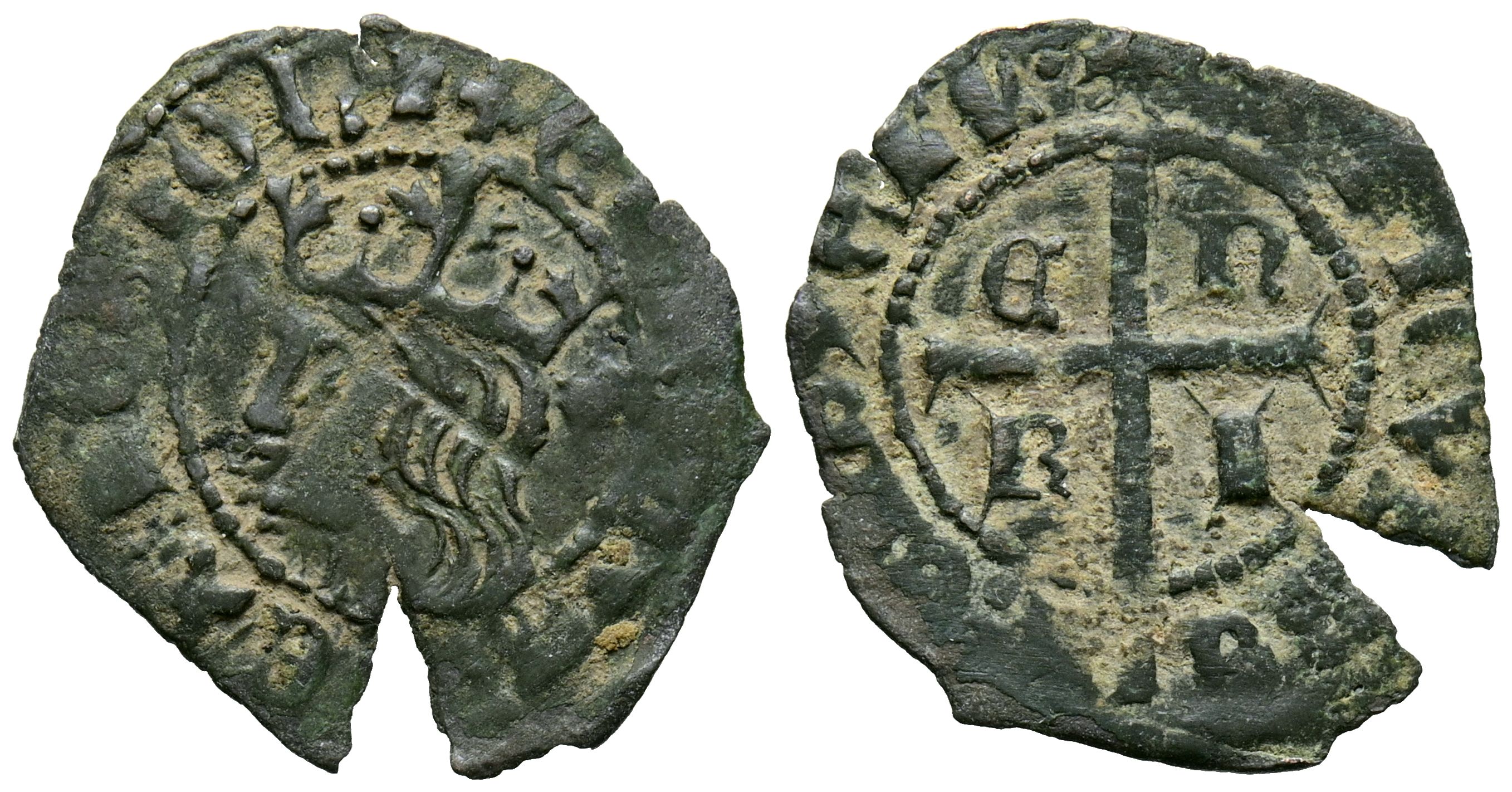 ENRIQUE II (1368-1379). Cruzado. (Ve. 0,77g/20mm). ¿Soria? (ceca no identificable con claridad). (¿Imperatrix E2: 11.63?). Anv: Cabeza coronada a izquierda, detrás marcas de ceca, todo dentro de gráfila circular y alrededor leyenda: ENRICVS REX LEGIONIS. Rev: Cruz latina rompiendo gráfila, en los cuarteles E-N-R-I y alrededor leyenda: ENRICVS REX CASTELLE. MBC. Interesante ejemplar. Este reverso, de letras góticas con astiles apuntados, es coincidente con la catalogación de Imperatrix E2: 11.63 y correspondiente a la ceca de Soria.