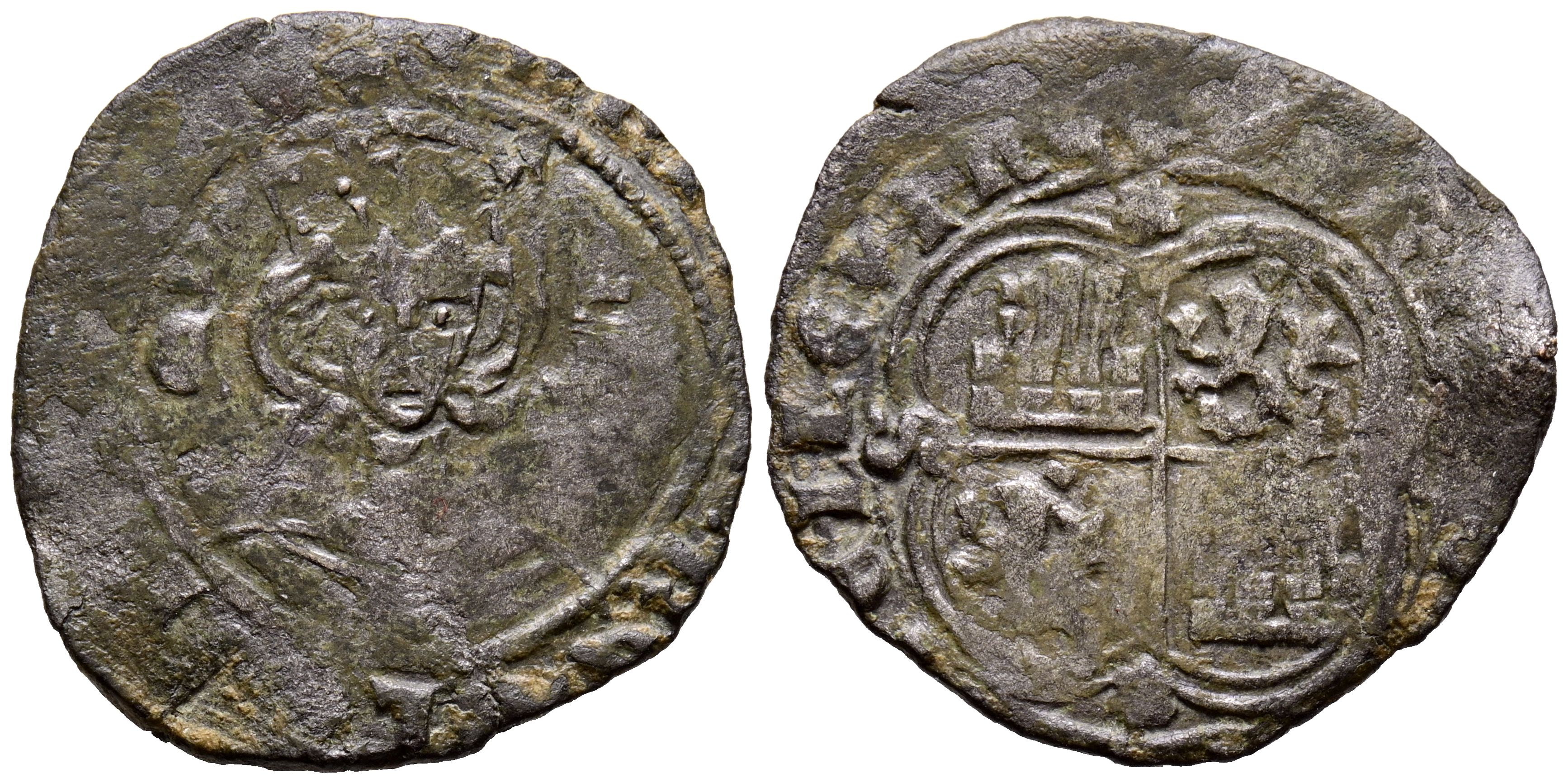 ENRIQUE II (1368-1379). 1/2 Real de Vellón. (Ve. 2,93g/25mm). Segovia. (Imperatrix E2:15.46; FAB-442 var). Anv: Busto coronado de frente de Enrique II entre E-N coronadas, todo dentro de gráfila circular, alrededor leyenda: ENRICVS REX LEGIONIS VINC. Rev: Cuartelado de castillos y leones rampantes dentro de gráfila de cuatro medios compases, a los lados las marcas S tumbada y E, alrededor leyenda: ENRICVS REX CASTELLE VINC. BC+. Escasa.