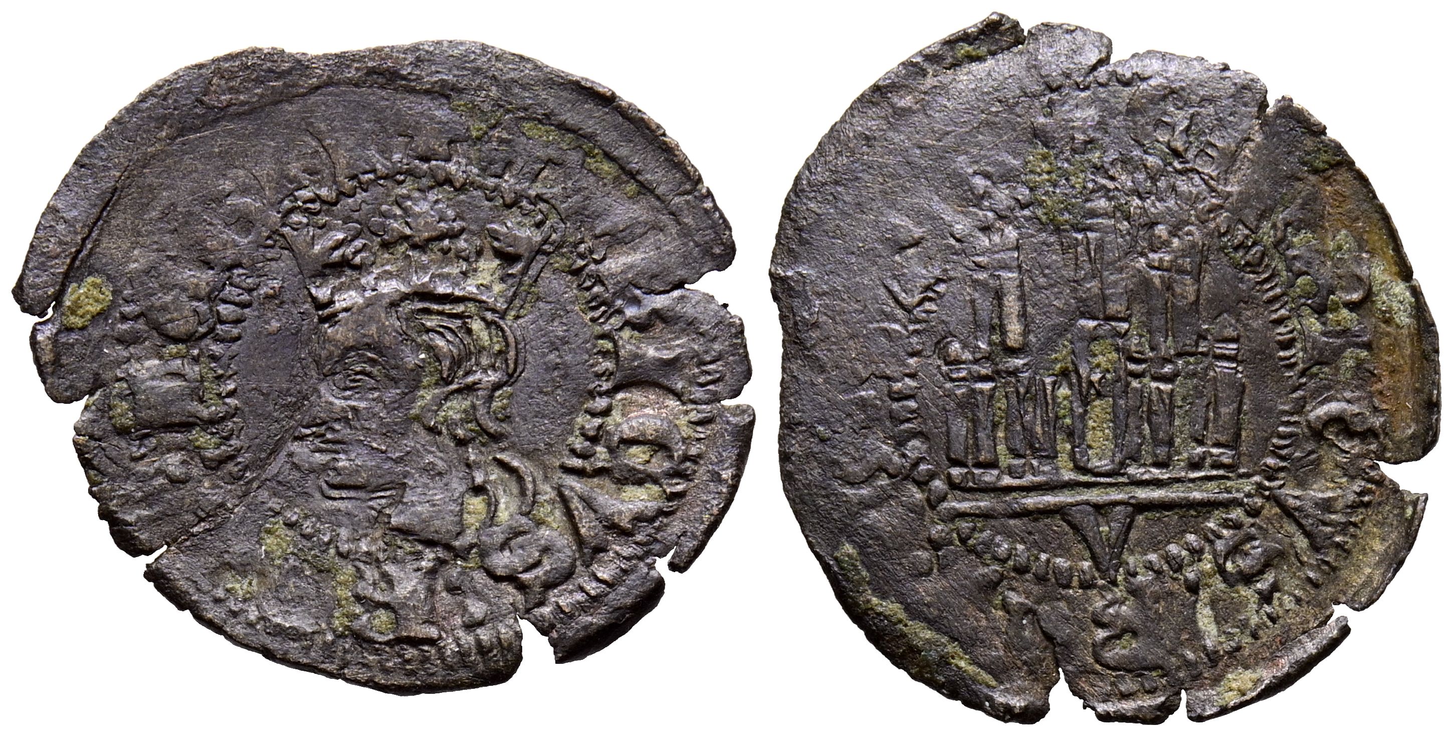 ENRIQUE II (1369-1379). Cornado. (Ve. 0,87g/21mm). Valencia de Alcántara o Valladolid. (Imperatrix E2:19.8; FAB-595, como Enrique III y ceca Villalón). Anv: Busto coronado de Enrique II a izquierda dentro de gráfila perlada, alrededor leyenda: ENRICVS REX LEGIO. Rev: Castillo, debajo V, todo dentro de gráfila perlada, alrededor leyenda: ENRICVS REX CAST. MBC. Leve doblez. Escasa.