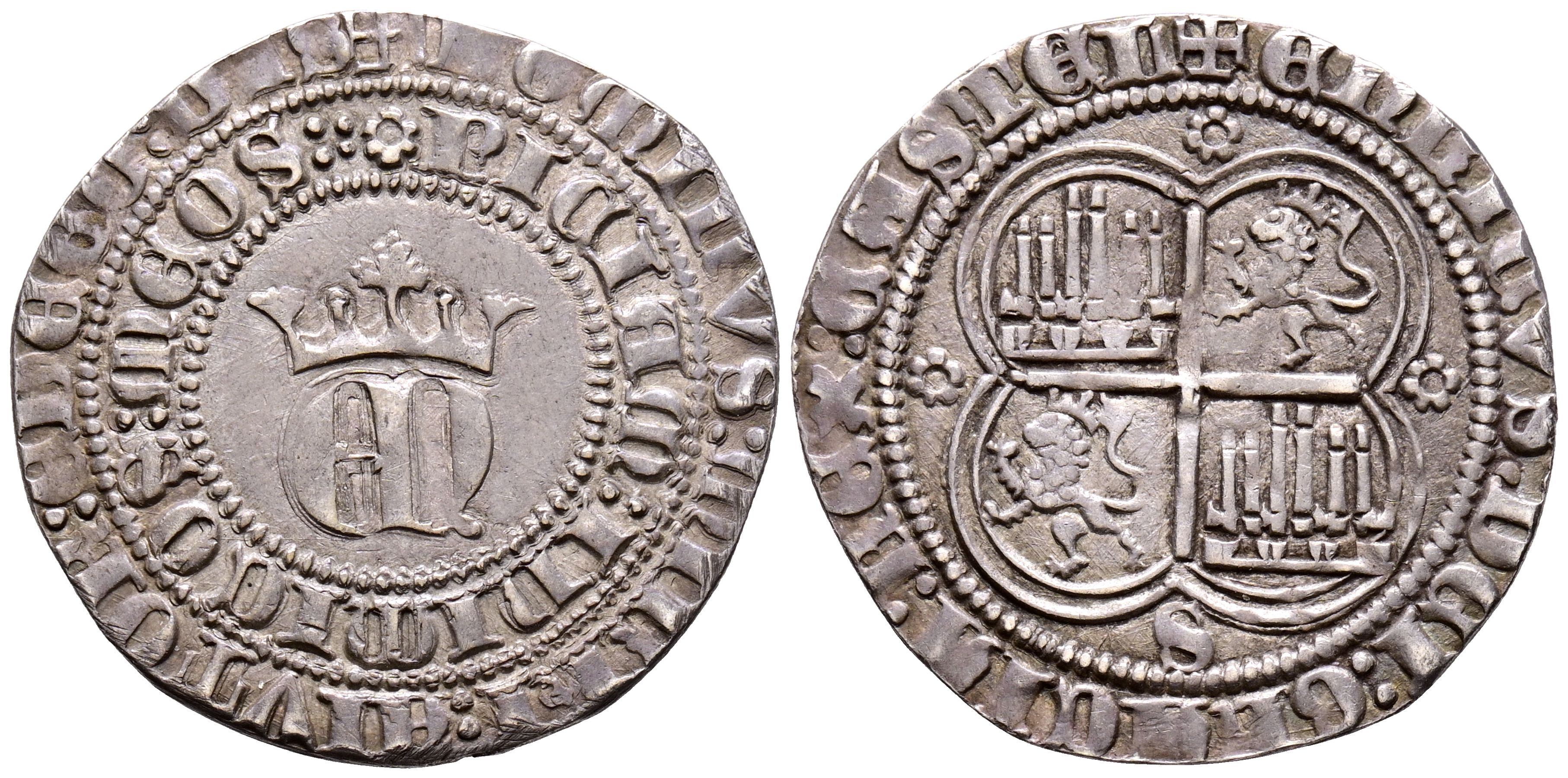 ENRIQUE II (1368-1379). Real (Ar. 2,87g/25mm). Sevilla. (Imperatrix E2:22.28; FAB-406). Anv: Anagrama EN coronado dentro de gráfila perlada, alrededor leyenda circular en dos líneas: DOMINVS MICHI ADIVTOR ET EGO DIS/PICIAM INIMICOS MEOS. Rev: Cuartelado de castillos y leones rampantes a izquierda dentro de gráfila cuatrilobular, debajo S, alrededor leyenda: ENRICVS DEI GRACIA REX CASTEL. EBC-. Buen ejemplar.