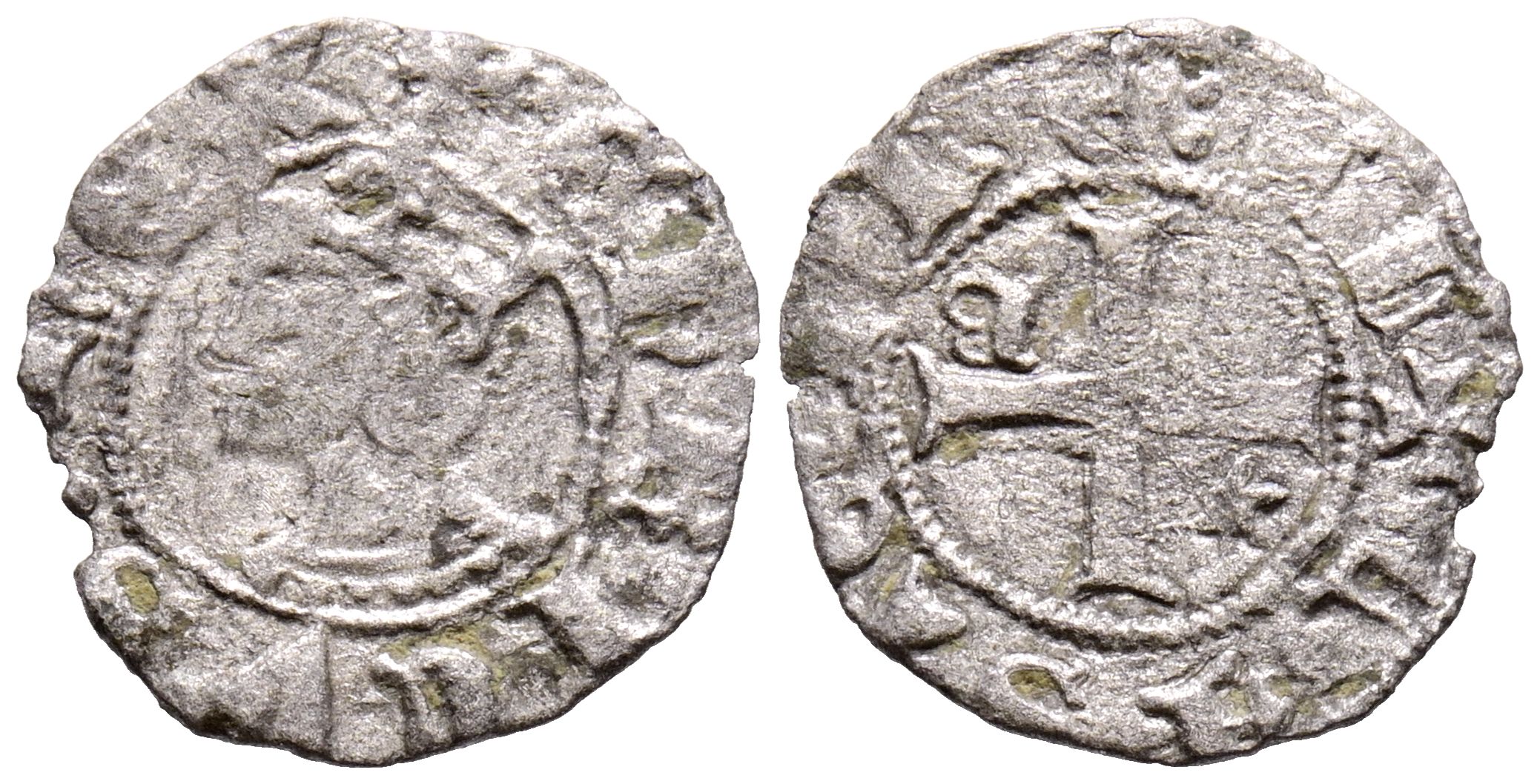 ENRIQUE II (1390-1406). Ciquen. (Ve. 0,55g/15mm). Burgos. (Imperatrix E2:30.6(50); FAB-611 como Seisen de Enrique II). Anv: Busto coronado de Enrique II a izquierda dentro de gráfila, alrededor leyenda: ENRICVS REX. Rev: Cruz patada con estrellas en 1º cuadrante y B en el 4º, todo dentro de gráfila circular, alrededor leyenda: CASTELLE EL. MBC. Vellón rico. Escaso.