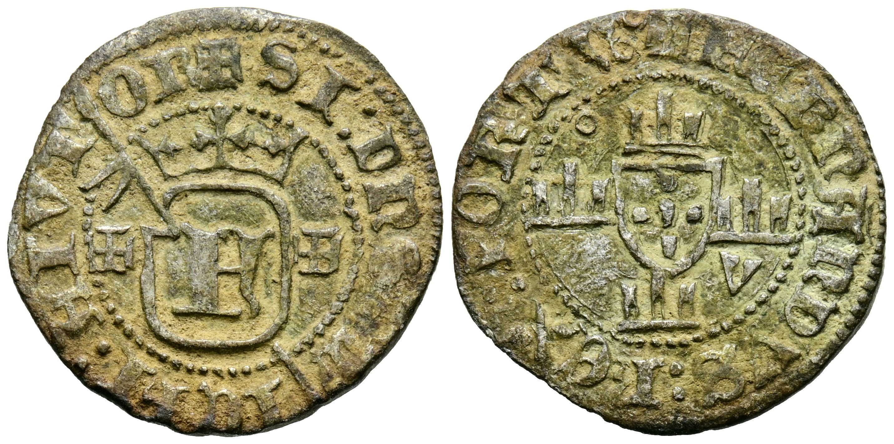 FERNANDO I DE PORTUGAL (1369-1371). Grave. (Ve. 1,98g/20mm). Valencia de Alcántara. (Imperatrix F1P:9,23; FAB-529var). Anv: F dentro de escudo coronado, entre dos cruces patadas, todo dentro de gráfila de puntos, alrededor leyenda: SI DNS MI CHI AIVT OR. Rev: Escudo de portugal rodeado de cuatro castillo, en el primer cuadrante roel y en el tercer cuadrante V, alrededor leyenda: FERNANDVS RES PORT. EBC-. Muy raro ejemplar, escaso así.