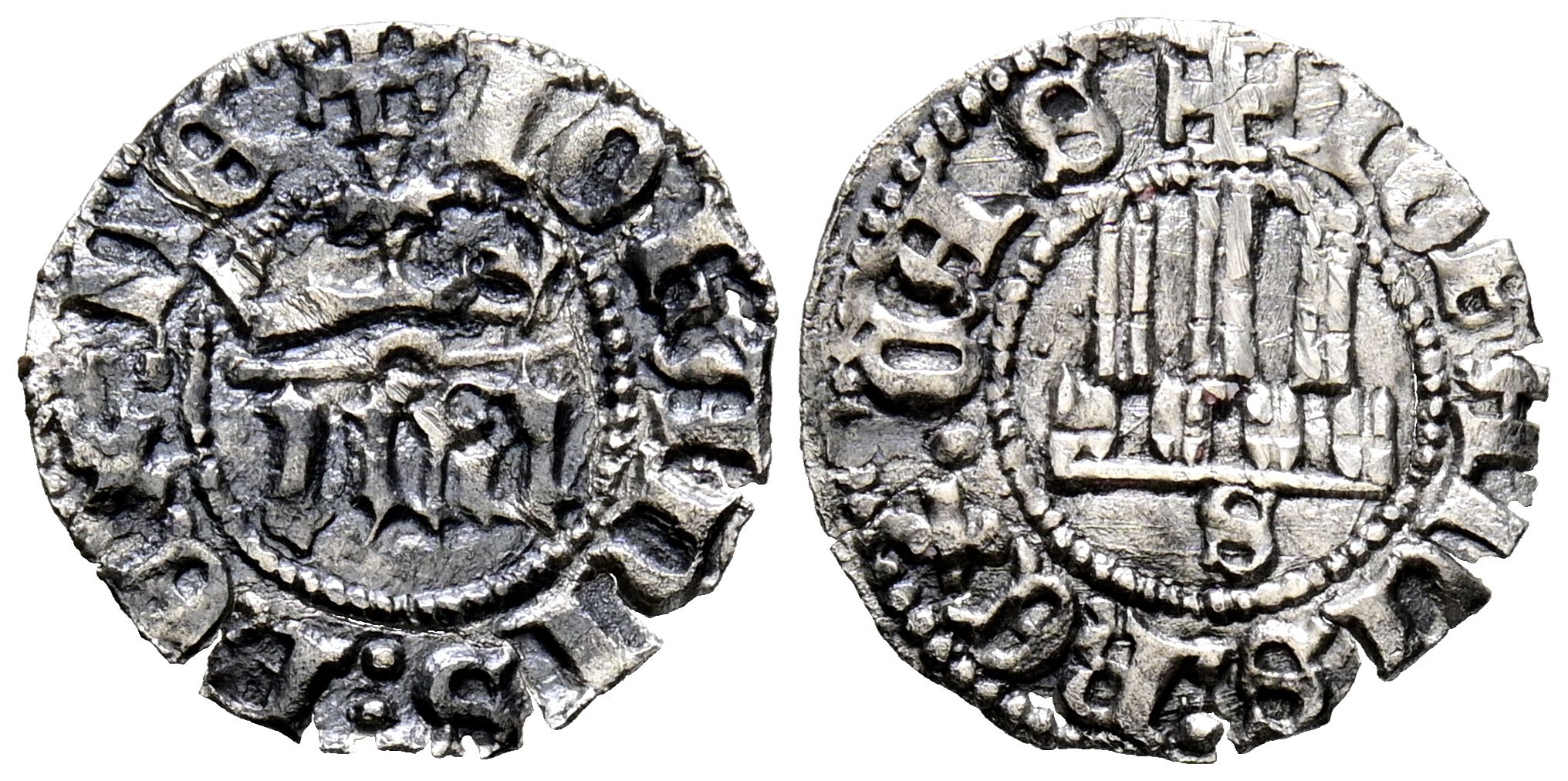 Juan I (1379-1390). 1/6 Real. (Ar. 0,53g/14mm). Sevilla. (Imperatrix J1:3.6; FAB-543). Anv: IOH coronadas dentro de gráfila circular, alrededor leyenda: IOHANIS REX E LEGI. Rev: Castillo, debajo S, todo dentro de una gráfila circular, alrededor leyenda: IOHANIS RESX CAS. MBC+. Limpiada.