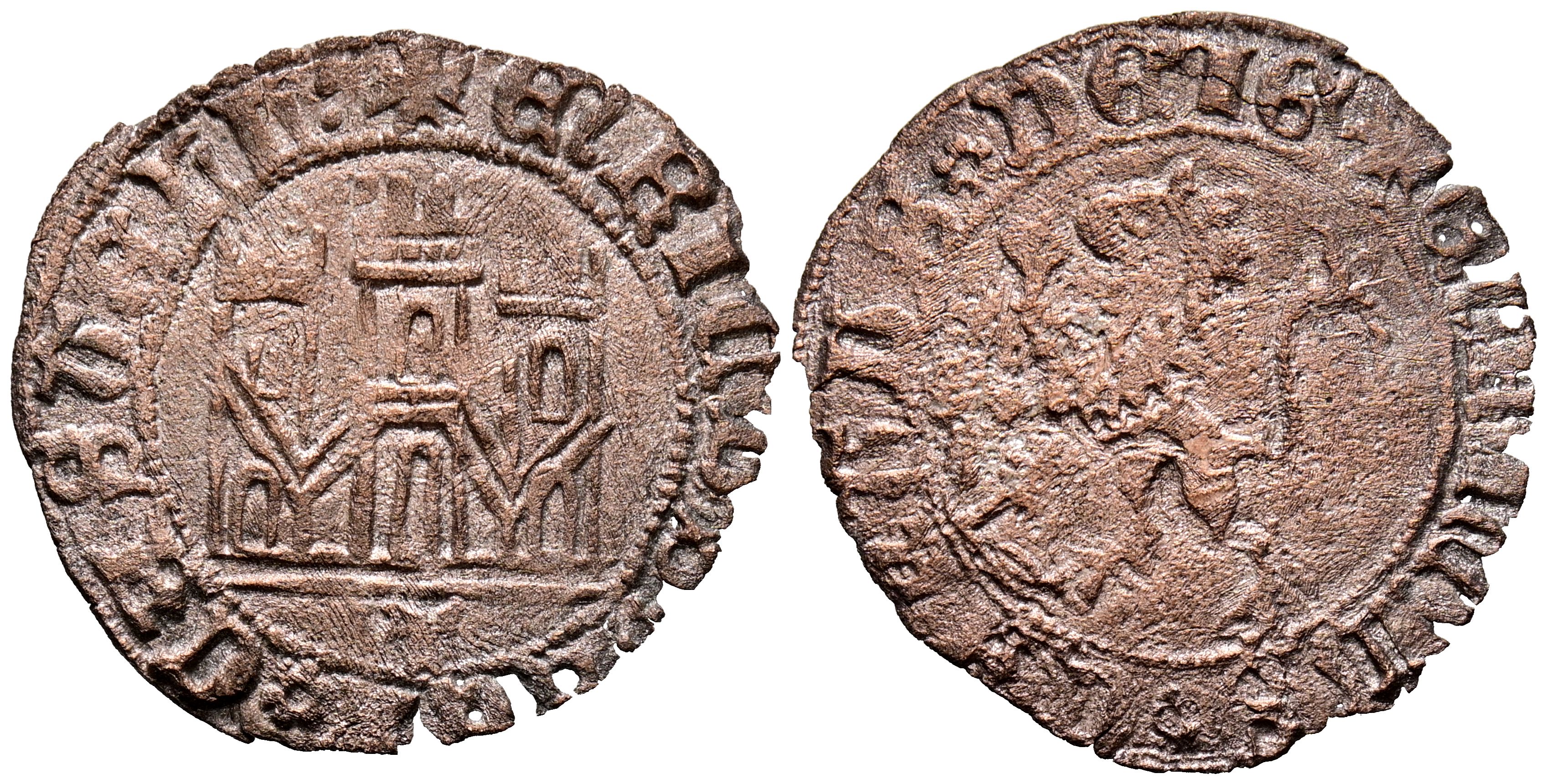 ENRIQUE IV (1454-1474). 1 Maravedí. (Ve. 1,39g/24mm). Toledo. (Imperatrix S4:3.8; FAB-807). Anv: Castillo, debajo T, todo dentro de gráfila circular, alrededor leyenda: ENRICVS REX CASTELLE. Rev: León coronado y rampante a izquierda dentro de gráfila circular, alrededor leyenda: ENRICVS CARTVS DEI G. MBC-. Limpieza química.