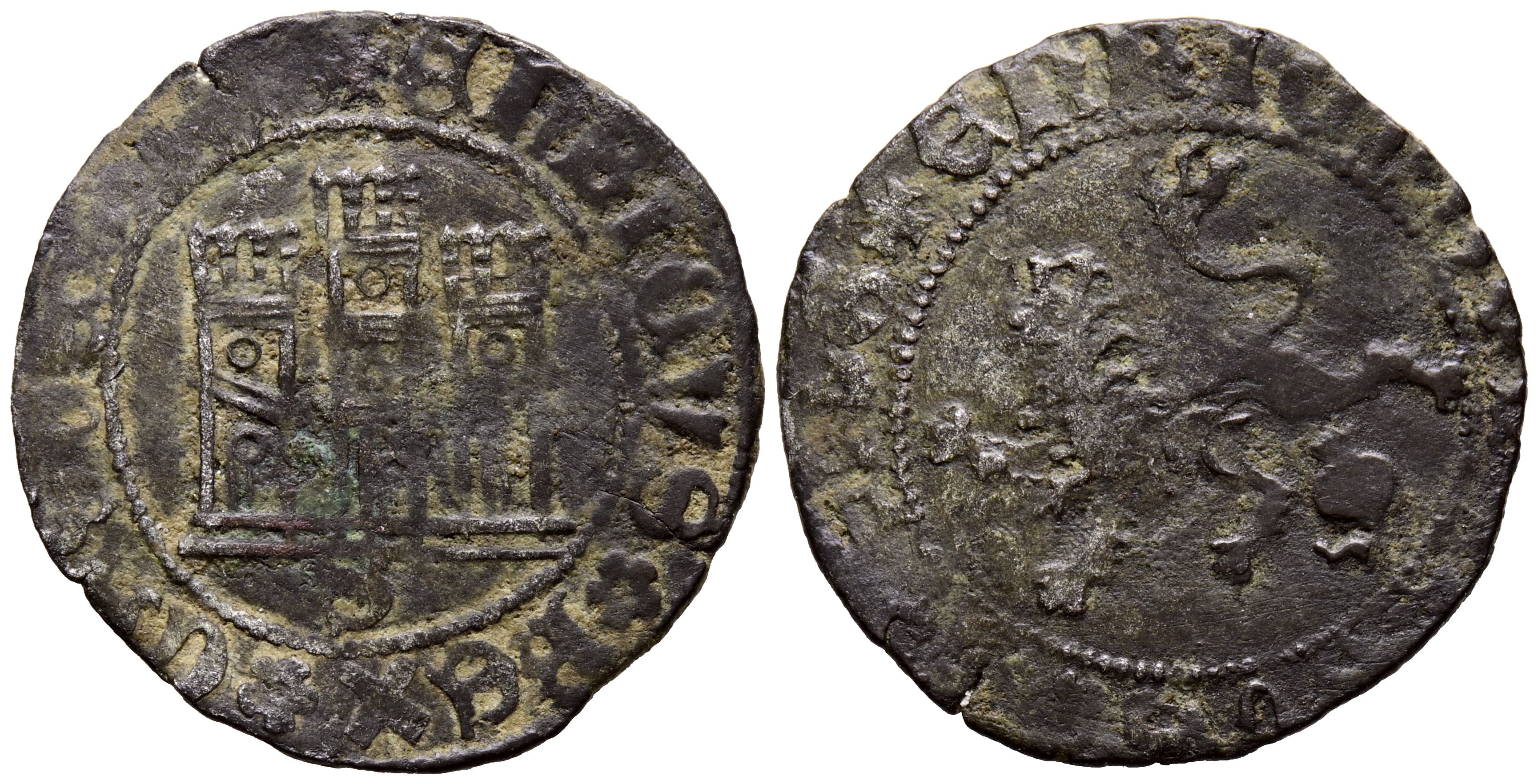 ENRIQUE IV (1454-1474). 1 Maravedí. (Ve. 2,44g/24mm). Sevilla. (Imperatrix E4:20.81; FAB-806.1). Anv: Castillo, debajo: S, todo dentro de gráfila circular, alrededor leyenda: ENRICVS REX CASTELLE. Rev: León coronado y rampante a izquierda con granada a sus pies, todo dentro de gráfila circular, alrededor leyenda: ENRICVS CARTVS DEI G. MBC.
