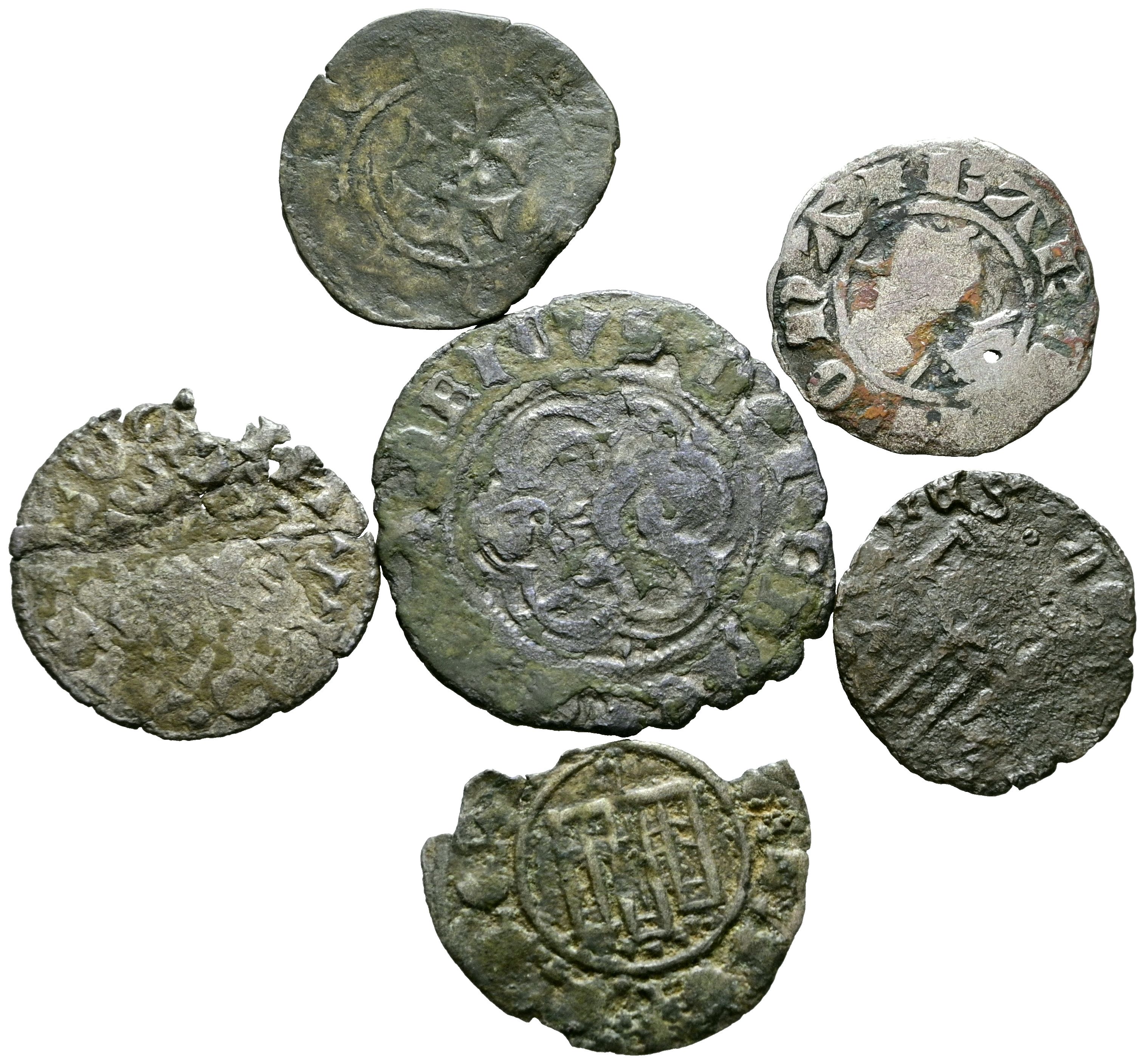 Interesante conjunto de 6 piezas corespondientes a las coronas de Castilla, León y Aragón. Diferentes monarcas, modulos, cecas y medidas. A EXAMINAR.