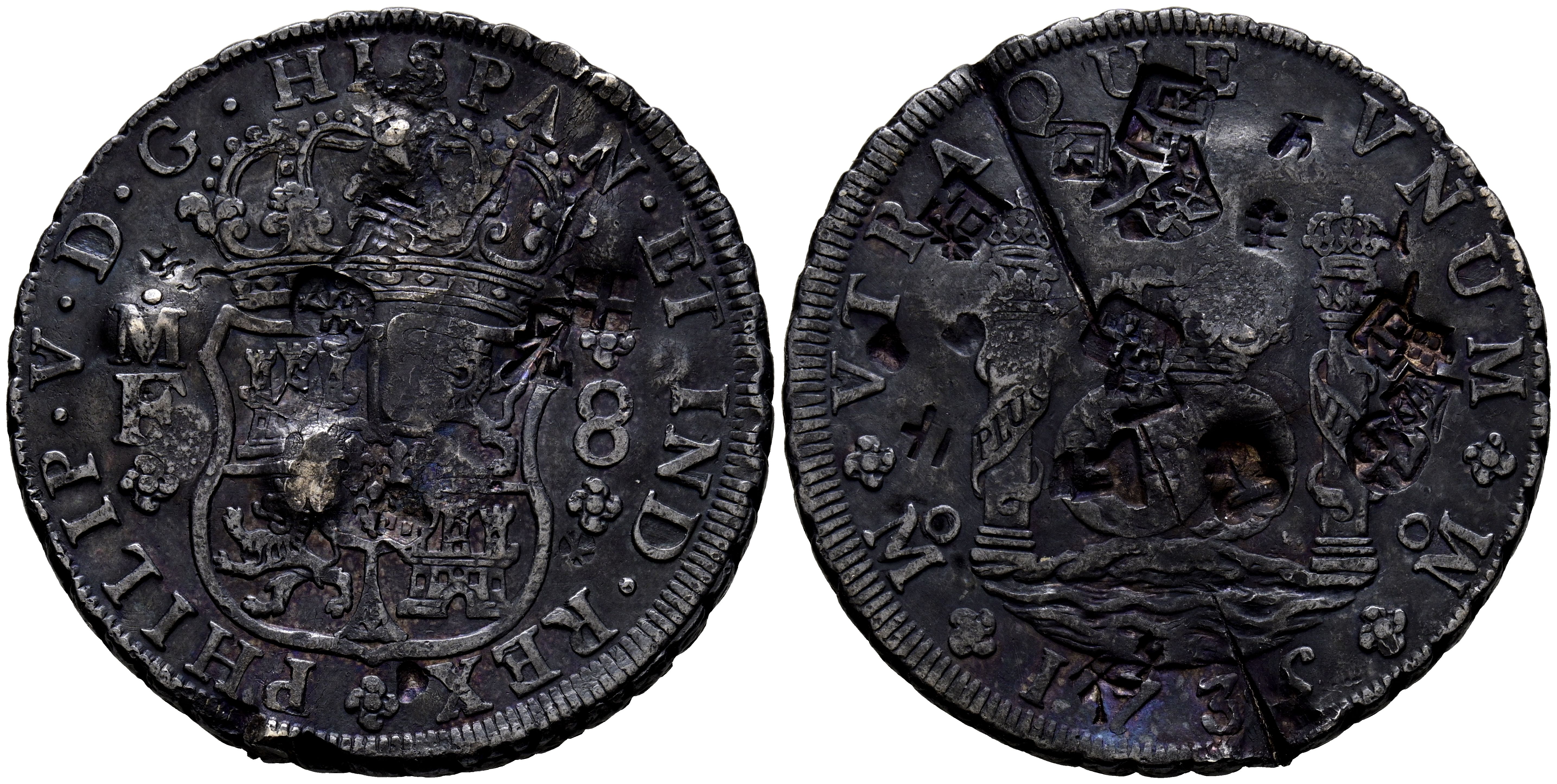 FELIPE V (1700-1746). 8 Reales. (Ar. 26,83g/40mm). 1735. Mexico MF. (Cal-2019-1443). BC+. Raya transversal. Múltiples resellos a examinar.