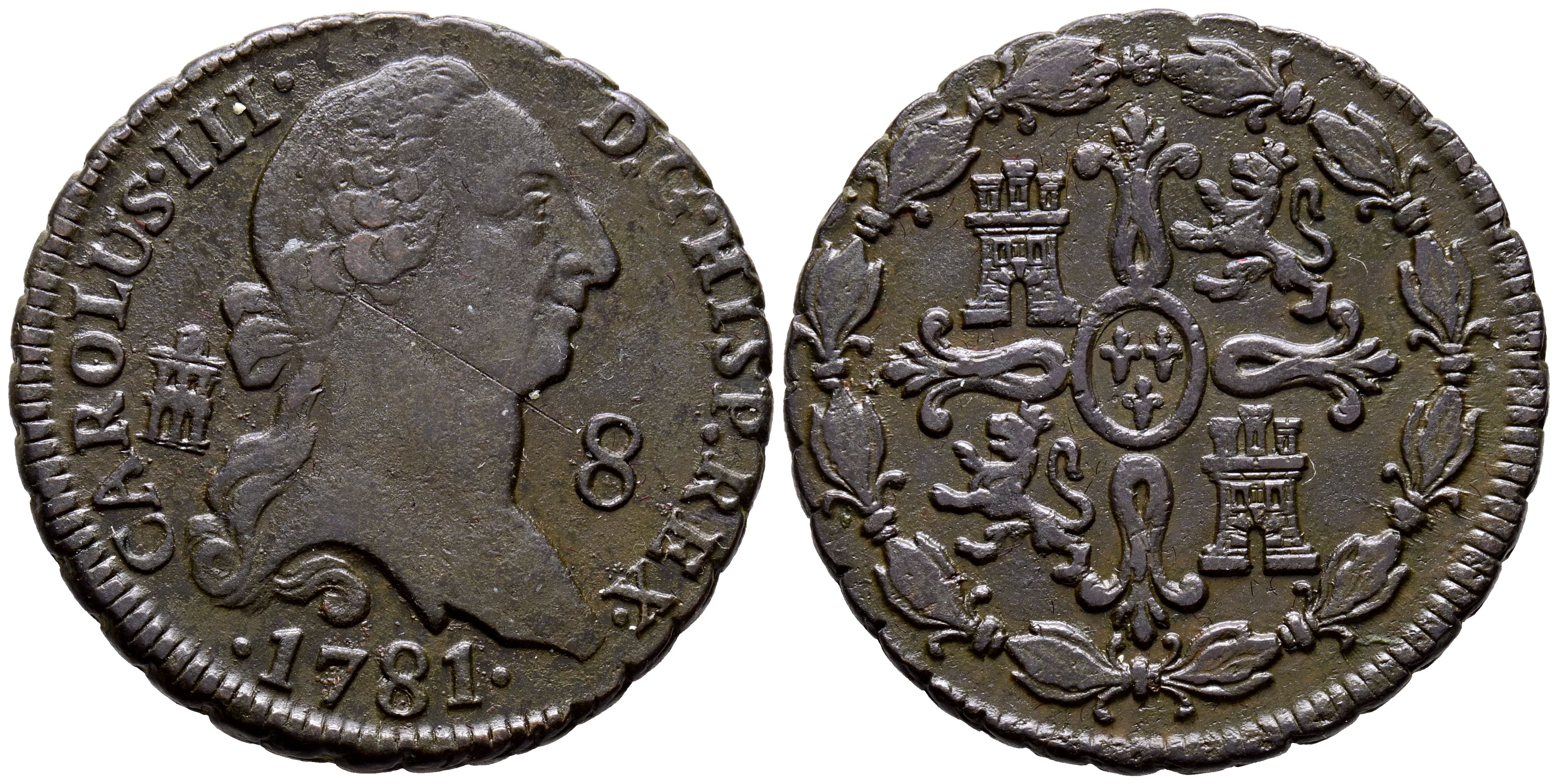 CARLOS III (1759-1788). 8 Maravedís (Ae. 11,66g/30mm). 1781. Segovia. (Cal-2019-78). MBC+. Raya en anverso.