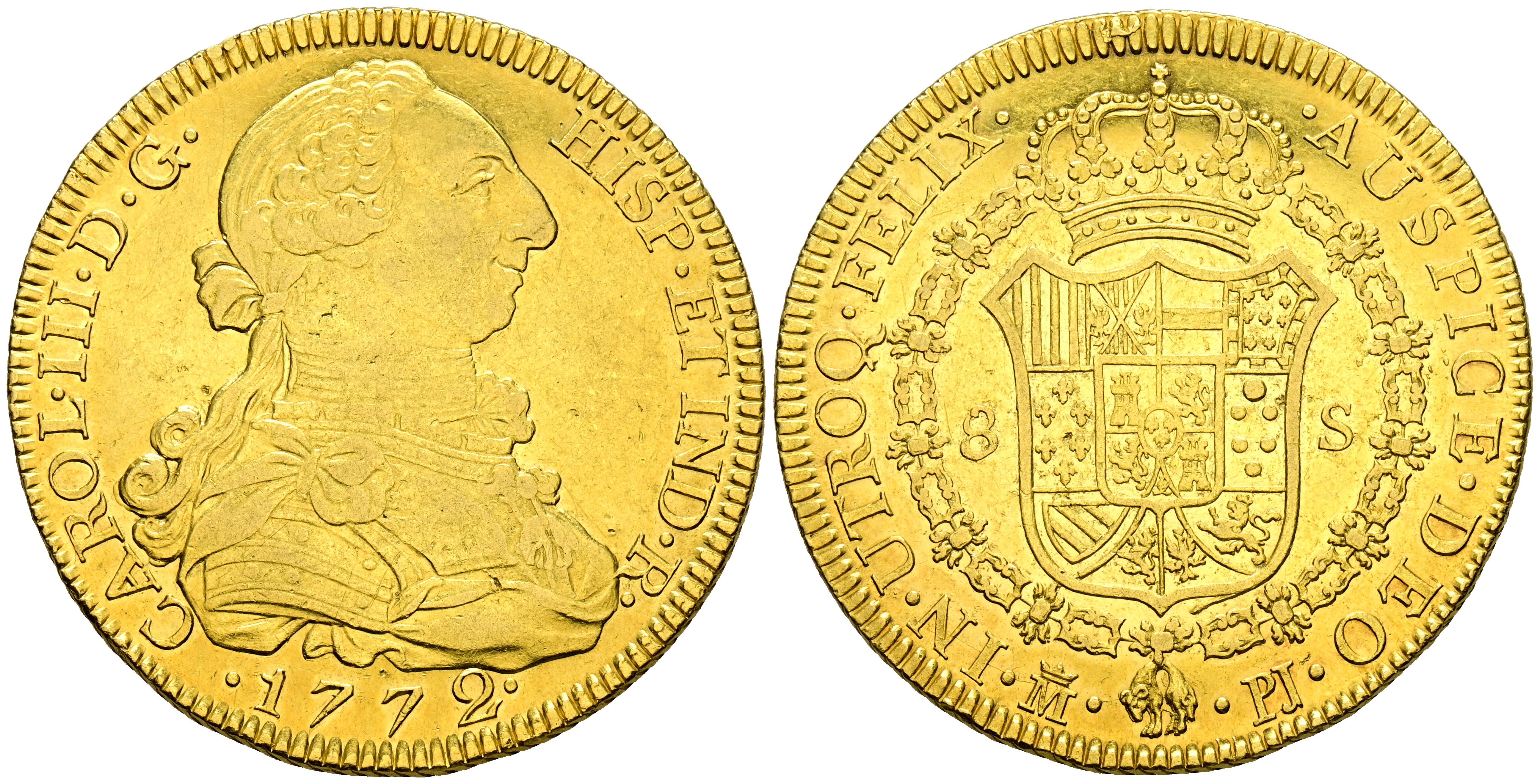 CARLOS III (1759-1788). 8 Escudos (Au. 27,03g/37mm). 1772. Madrid PJ. (Cal-2019-1956). Primer año de busto propio. EBC+. Brillo original. Escasa y más así.