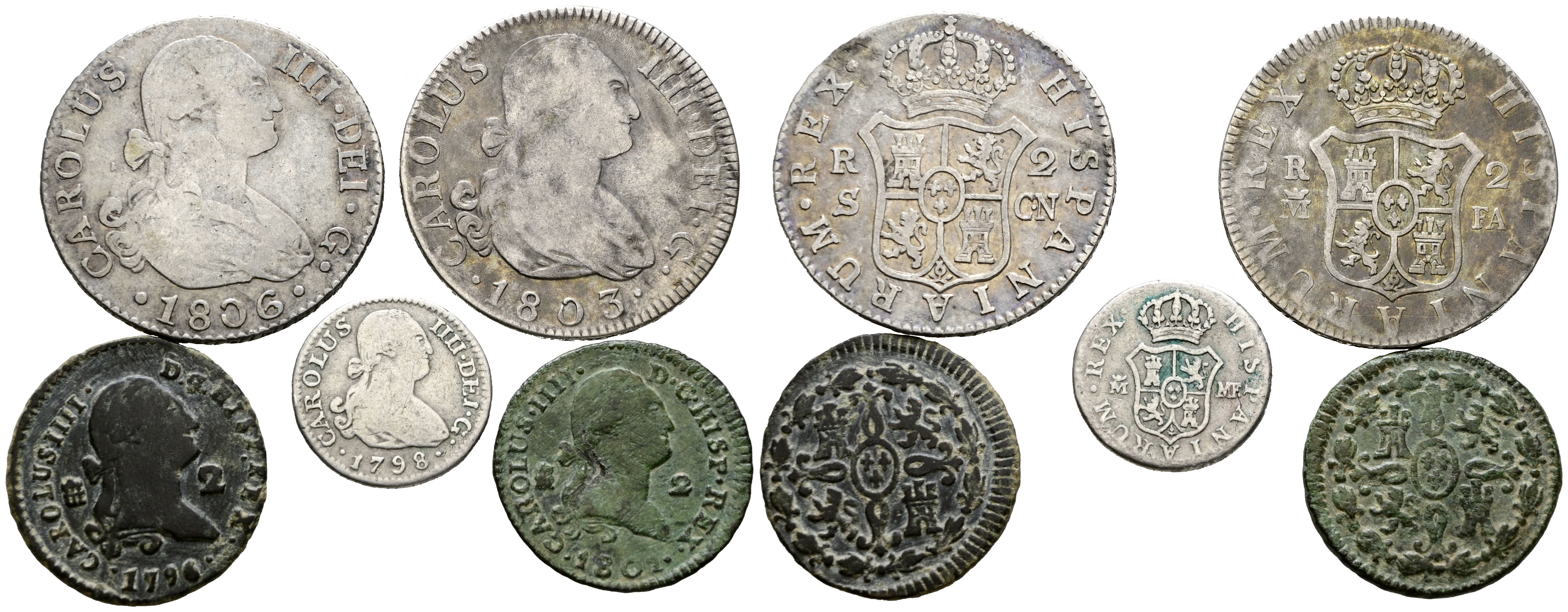 CARLOS IV (1788-1808). Interesante conjunto de 5 piezas (2 en cobre y 3 en plata) acuñadas en cecas peninsulares (Segovia, Sevilla y Madrid) con variedad de módulos, fechas y estados de conservación. A EXAMINAR.