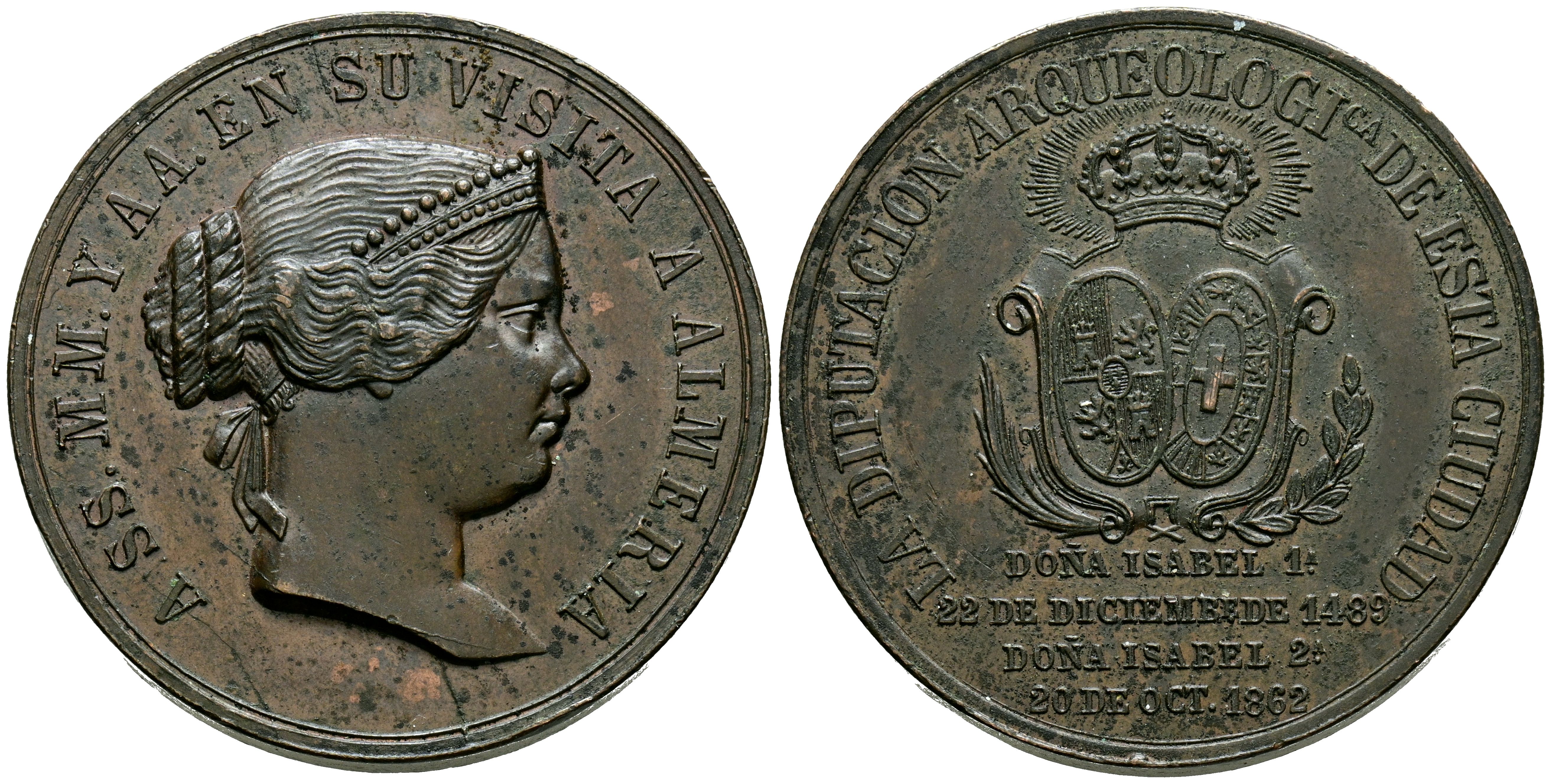 ISABEL II (1833-1868). Visita a Almería (Ae. 23,51g/37mm). 1862. Diputación Arqueológica. (RAH. 643-644). MBC+. Escasa.