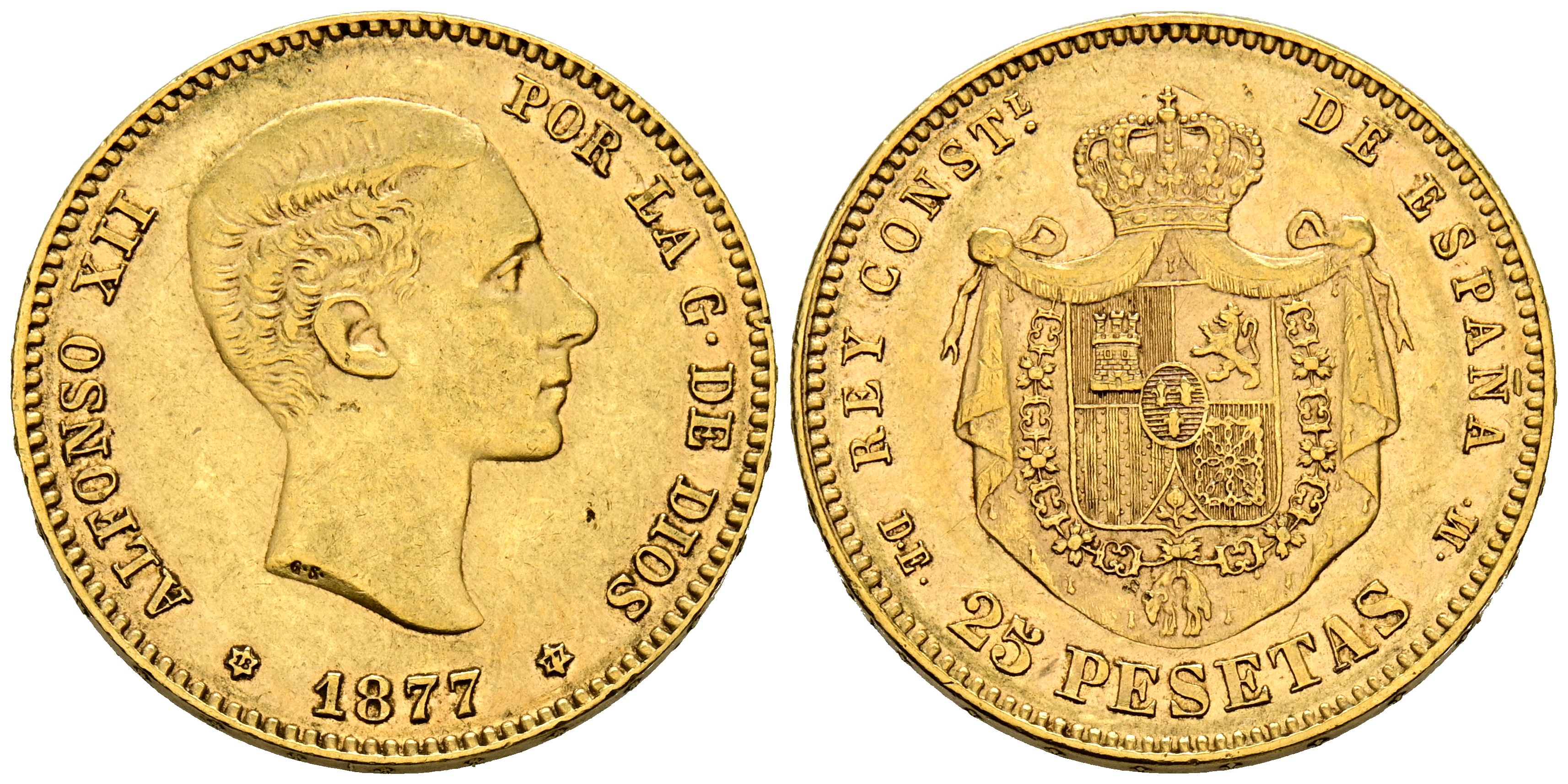 ALFONSO XII (1874-1885). 25 Pesetas. (Au. 8,04g/24mm). 1877 *18-77. Madrid DEM. (Cal-2019-68). MBC.