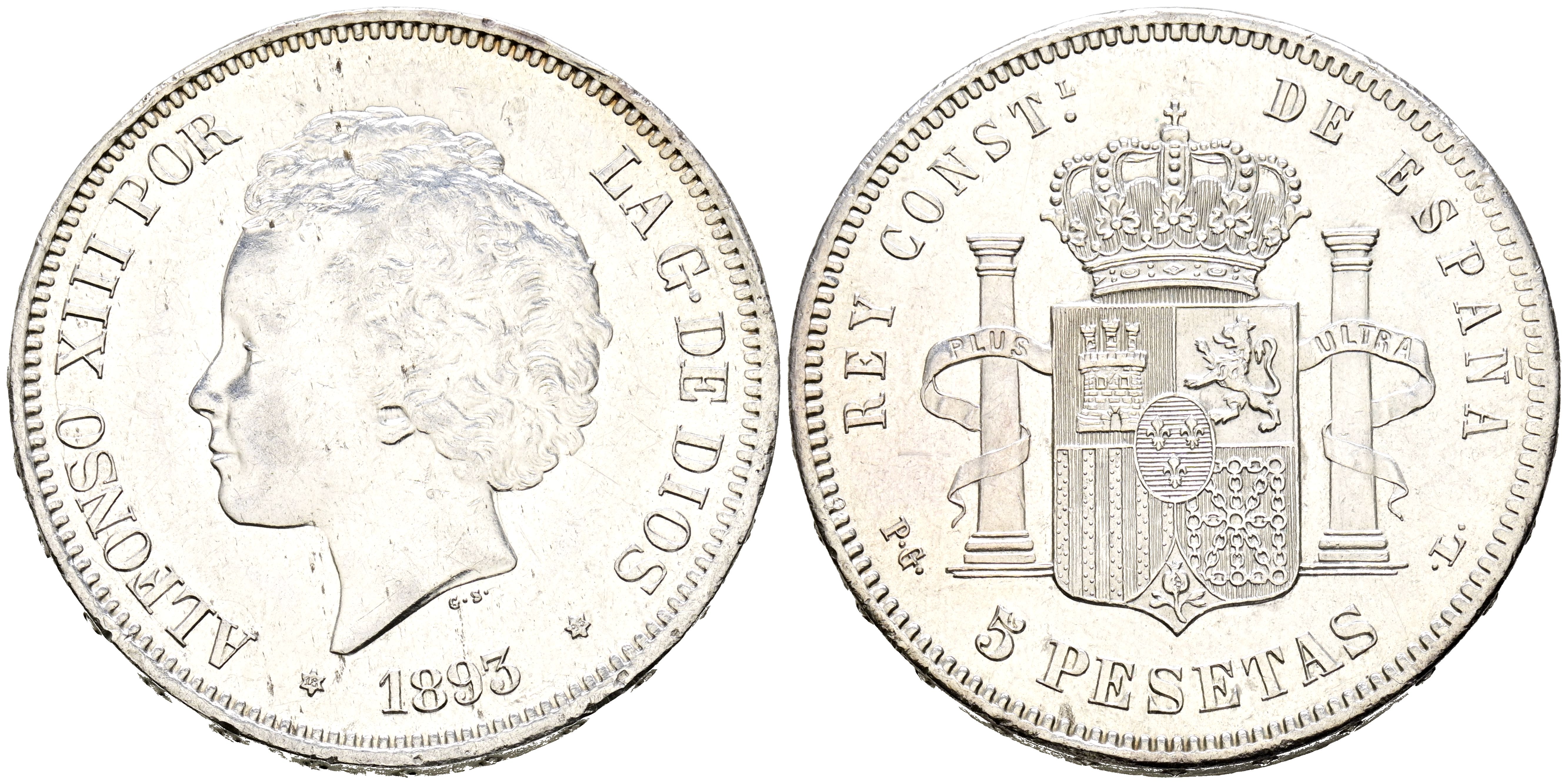 ALFONSO XIII (1885-1931). 5 Pesetas. (Ar. 25,18g/37mm). 1893 *18-93. Madrid PGL. (Cal-2019-102). MBC+.