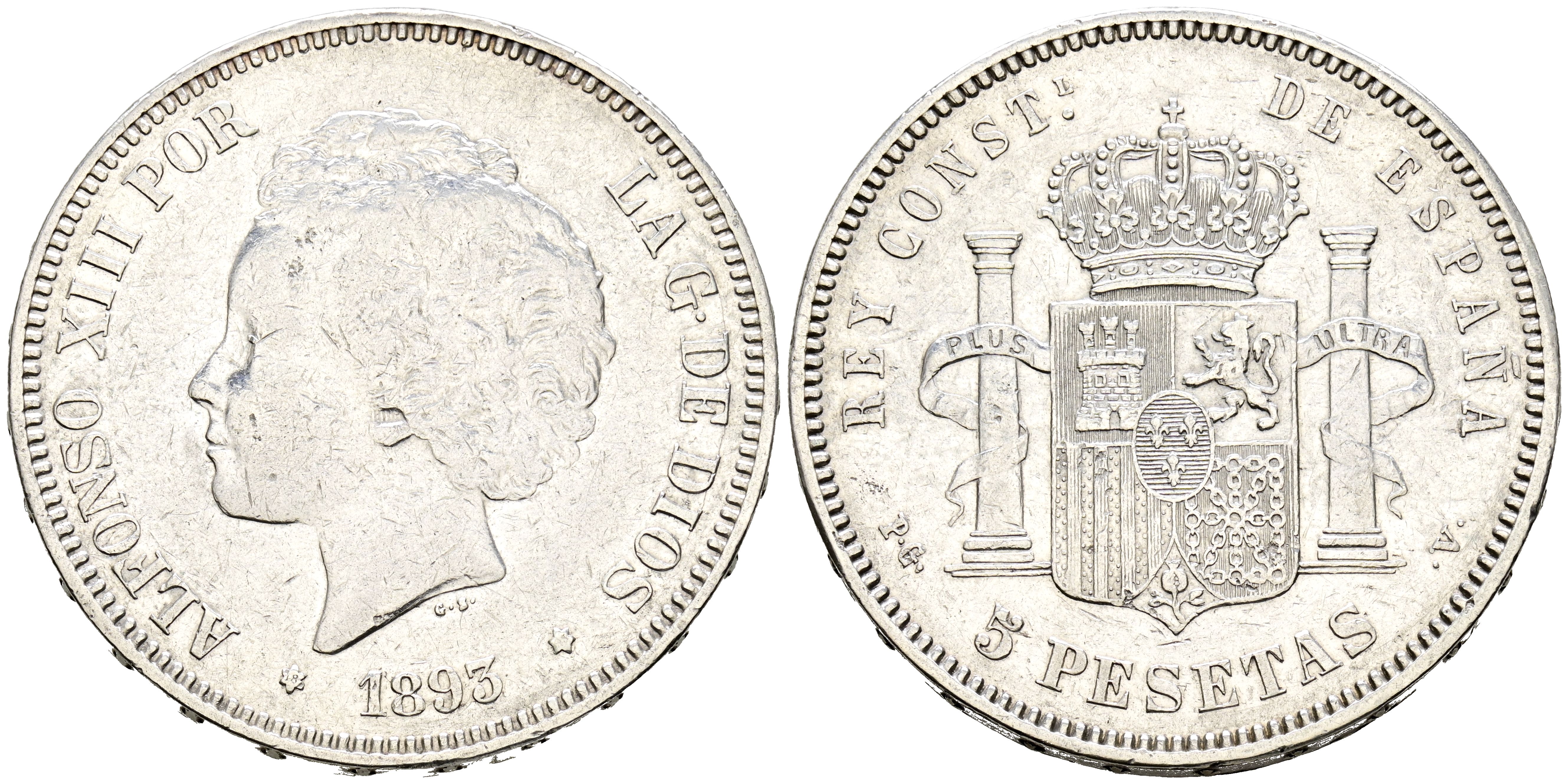ALFONSO XIII (1885-1931). 5 Pesetas (Ar. 24.88g/37mm). 1893 *18-93. Madrid. PGV. (Cal-2019-103). MBC. Segunda estrella apenas visible.