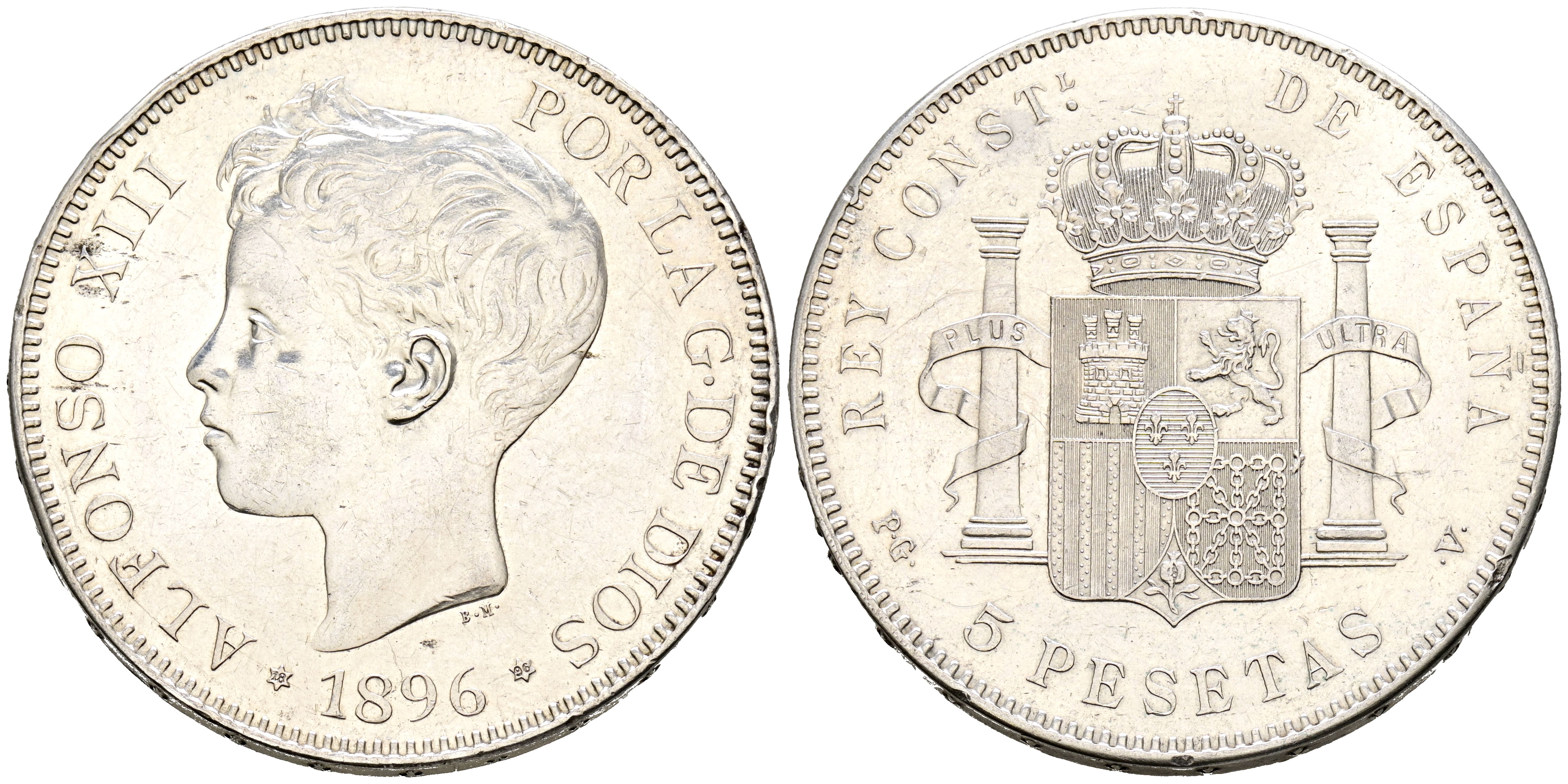 ALFONSO XIII (1885-1931). 5 pesetas. (Ar. 24,89g /37mm). 1896 *18-96. Madrid PGV. (Cal-2019-106). EBC-. Limpiada.