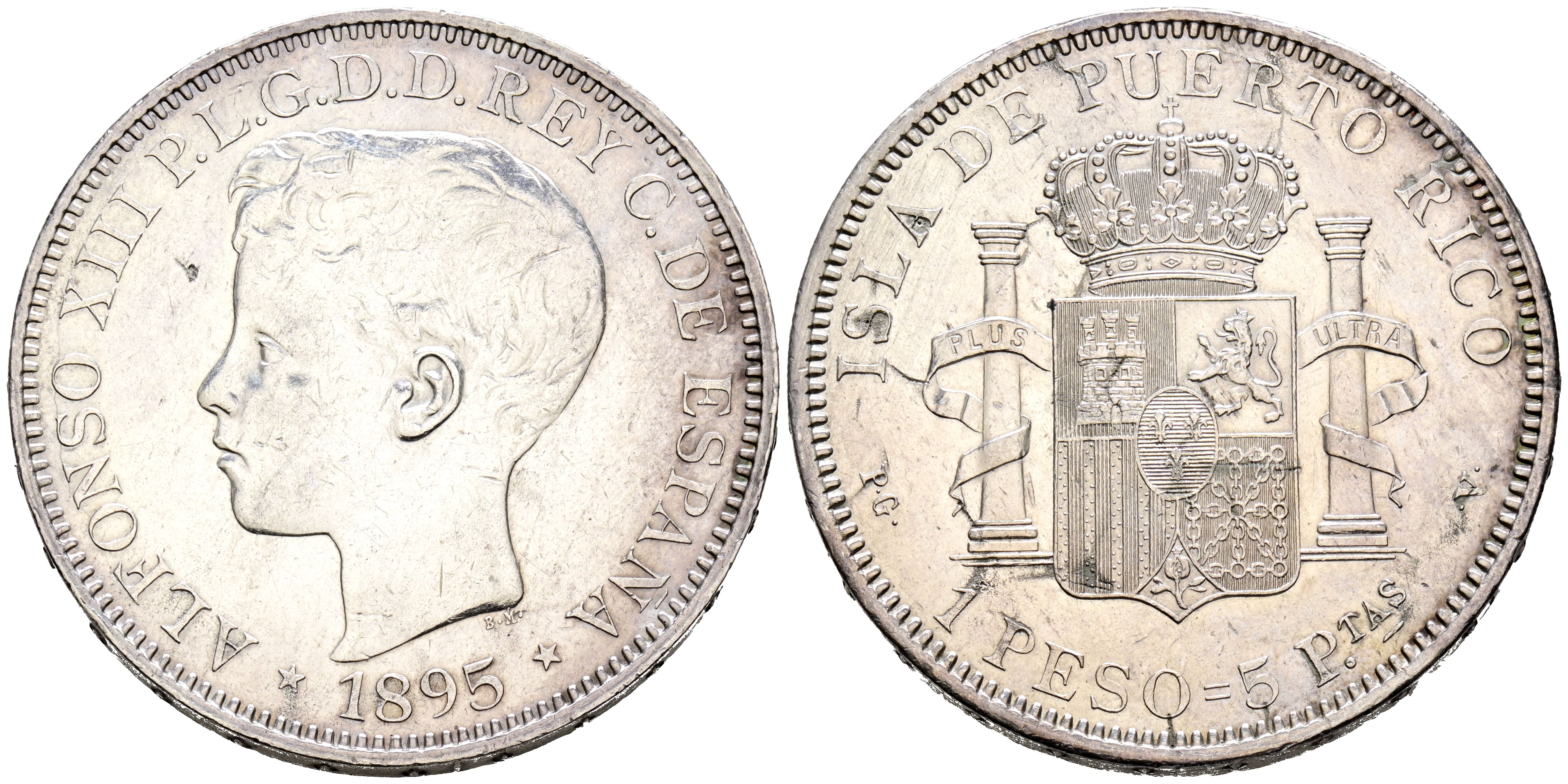 ALFONSO XIII (1885-1931). 1 Peso. (Ar. 24,96g/38mm). 1895. Puerto Rico PGV. (Cal-2019-128). MBC+. Limpiada.